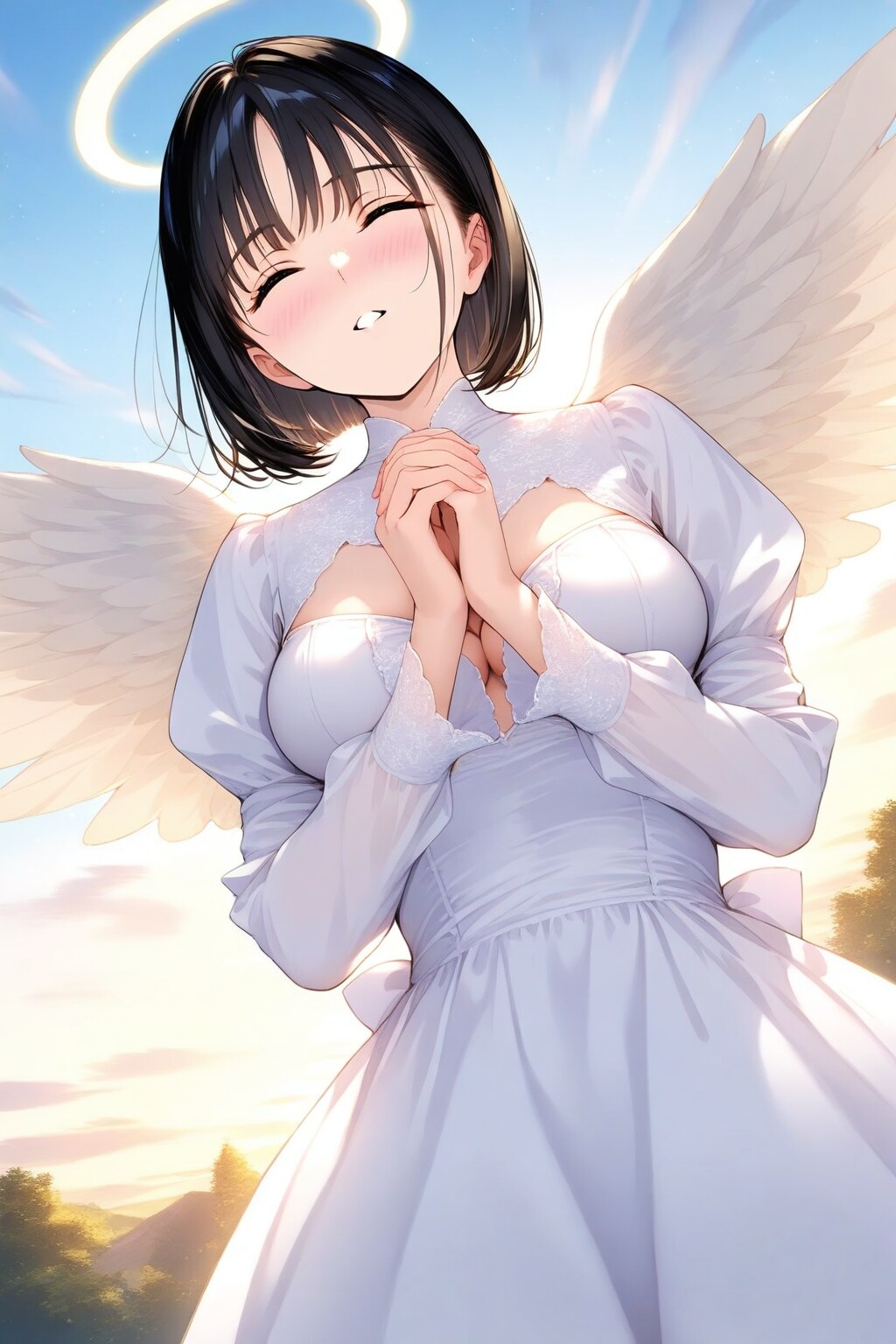 祈りのポーズ完璧ですねwチラリと見える谷間にどきっとします…(〃ω〃)