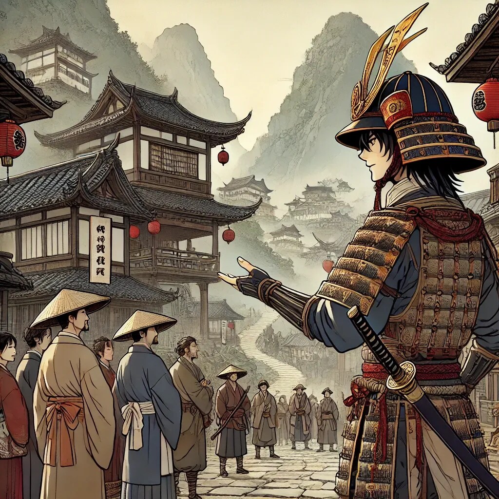 山腹の宿場町。巡礼者たちに警告を出しているのは、ヒデヨシ軍の兵。