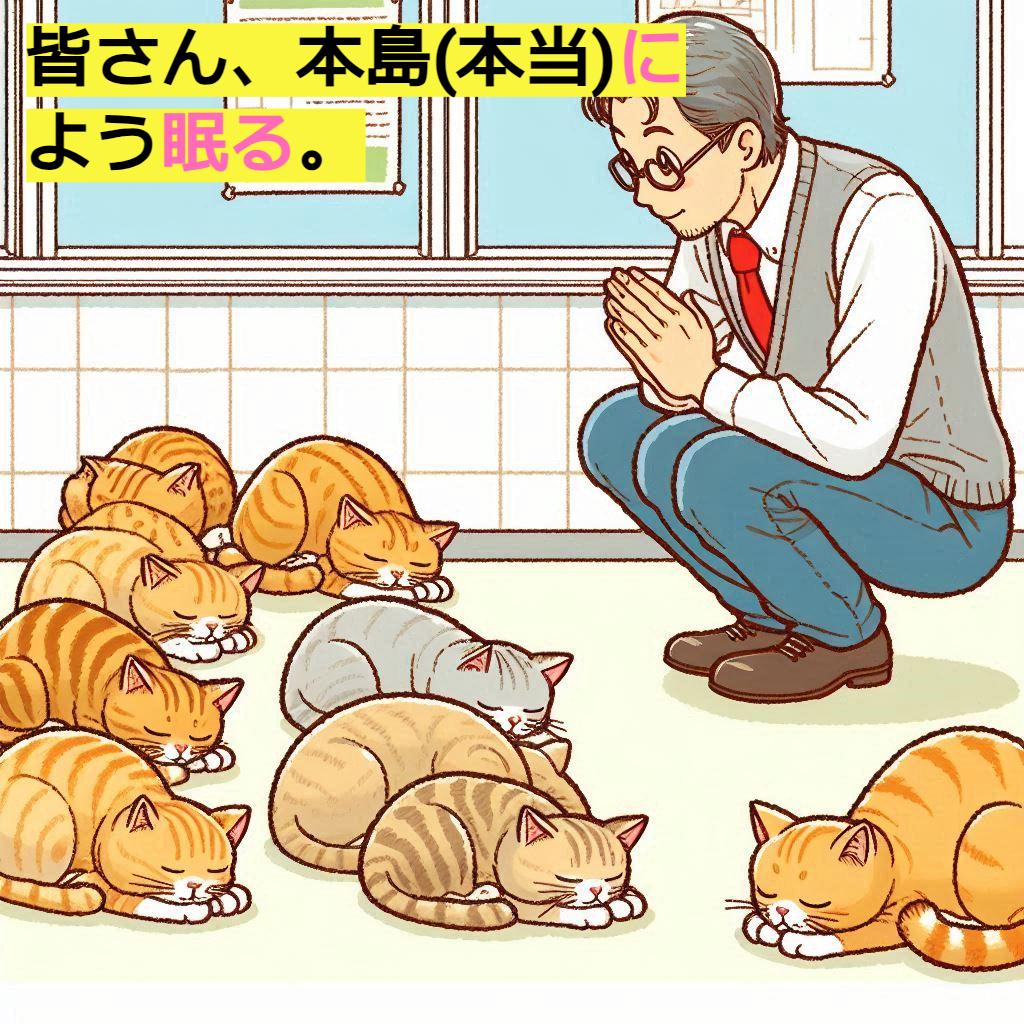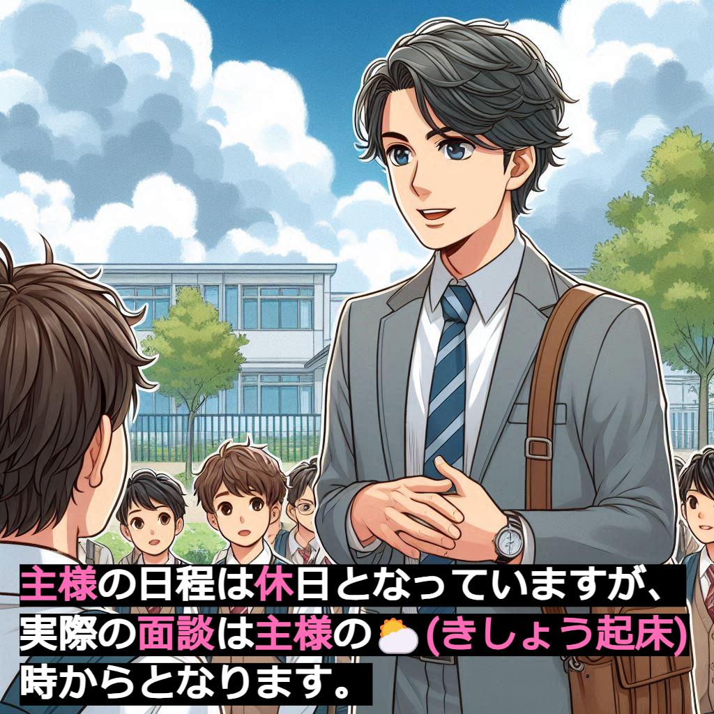 「皆さん、本島(本当)によう眠る。主様の日程は休日となっていますが、実際の面談は主様の🌤(きしょう:起床)時からとなります。」