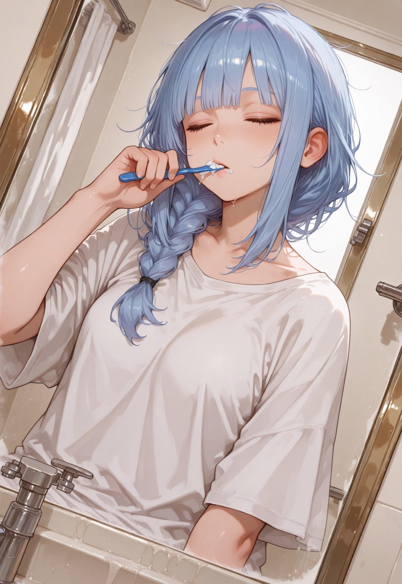 blunt bangs,skyblue hair,short hair,(draped a single big and semi-long braid),up style,light orange eyes,half closed eyes,small breast,