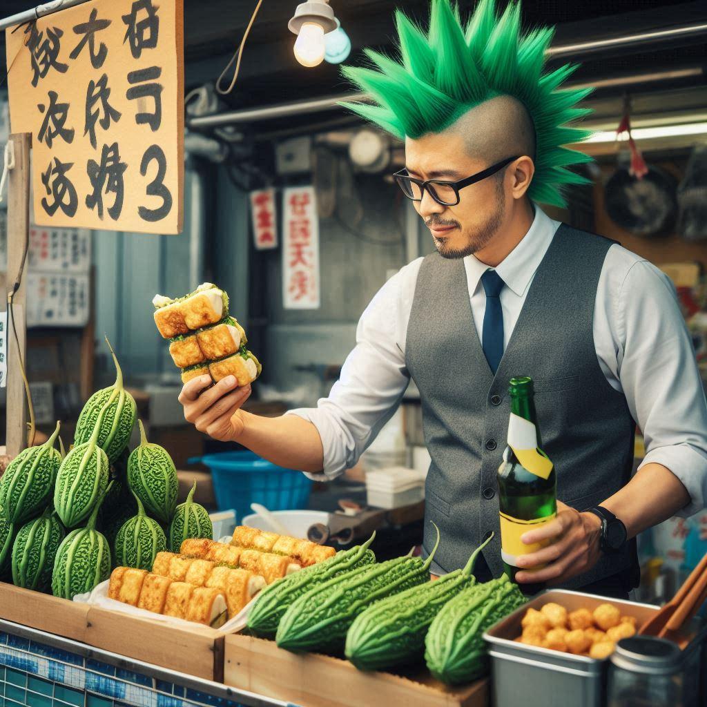 商品開発部がお祭り限定品として開発した『ゴーヤの挟み揚げ(580円)』とゴーヤの苦味が癖になる『ゴーヤビール(580円)』を販売する予定でございます。