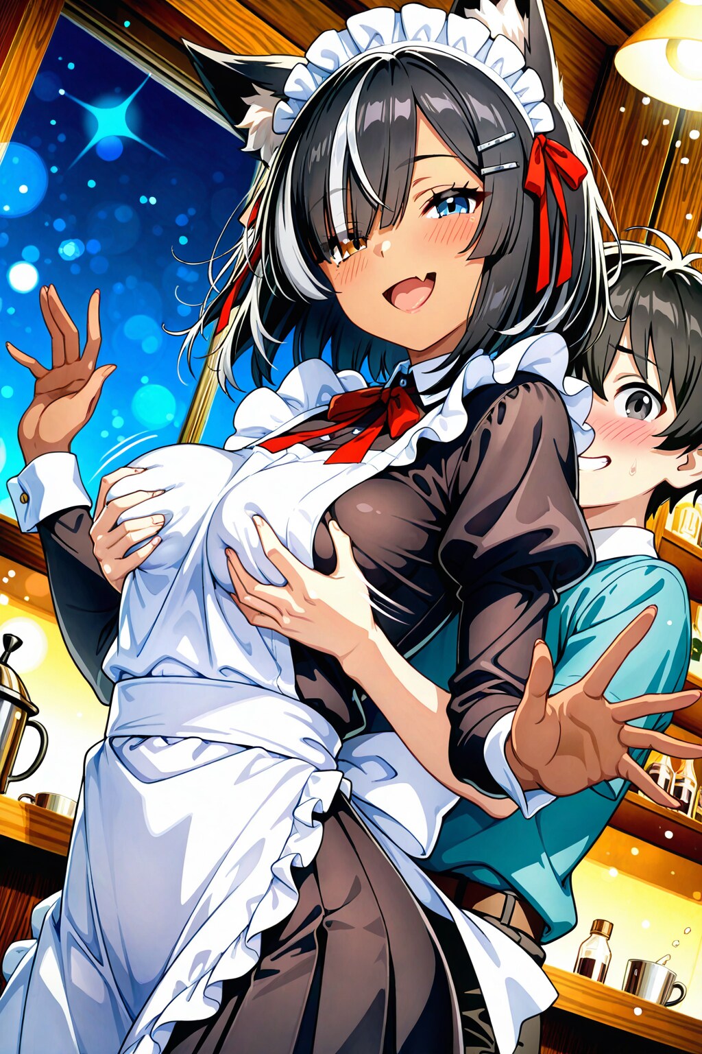 日焼け以上に髪の毛の色移りで苦戦した覚えのある子ですね。目は(blue eyes heterochromia),で、茶色の目は肌色から持ってきてもらうようにしました。