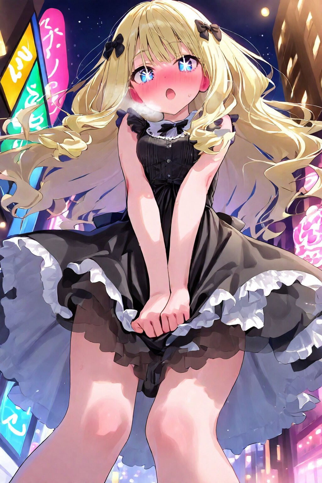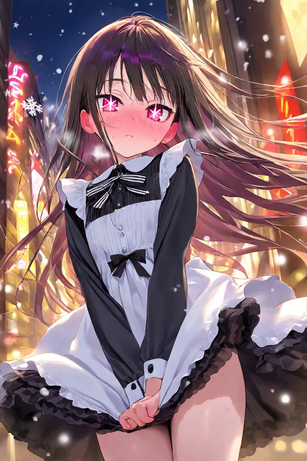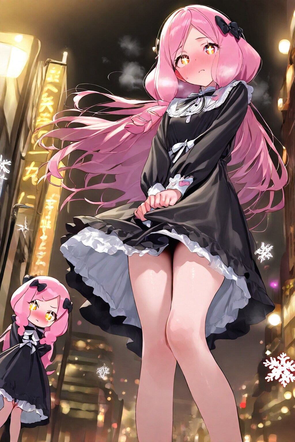 【SPICE版】夜の街中に立つふわふわ髪のちびキャラ ~ 冬の可憐な赤と黒の少女