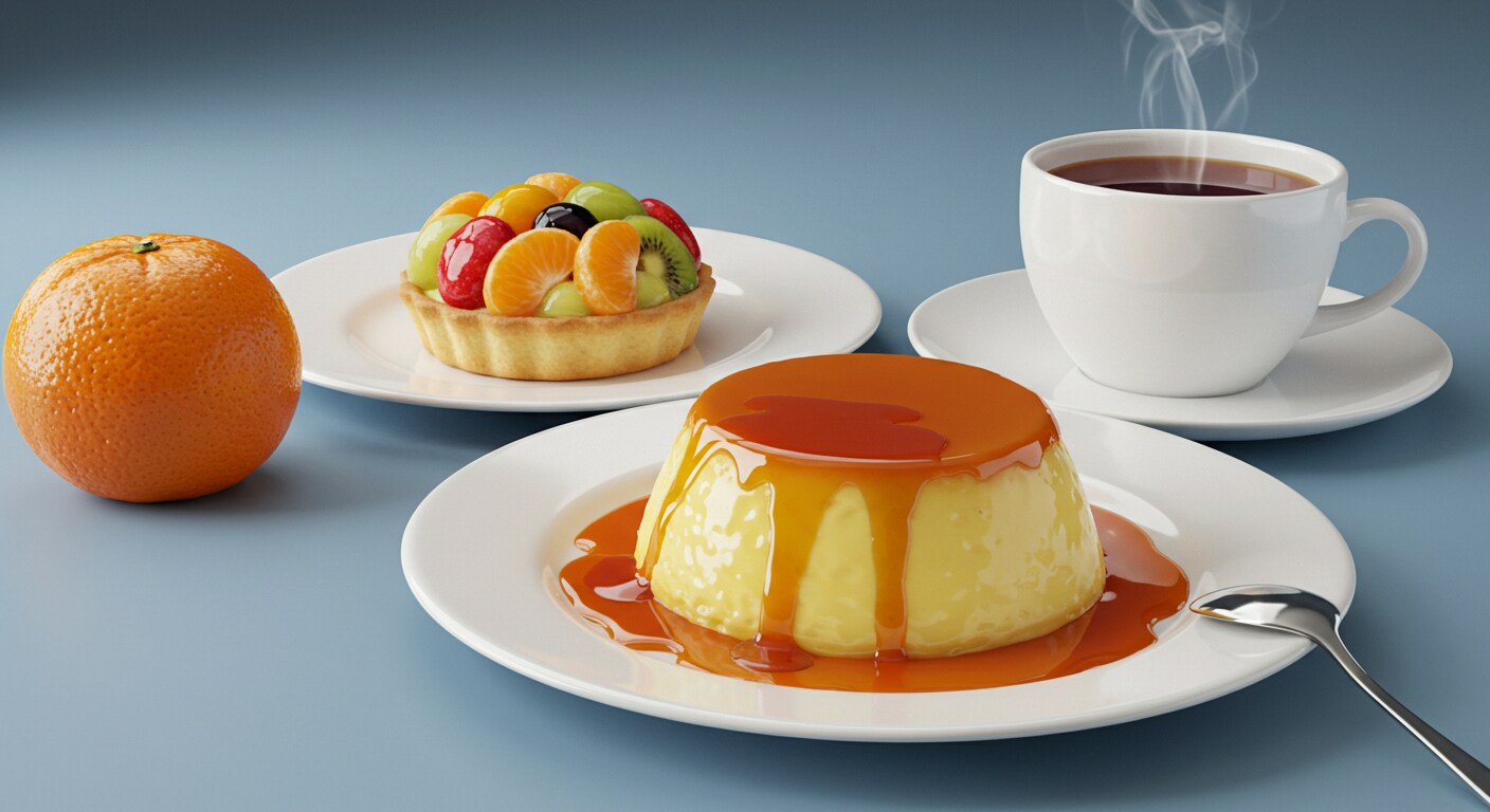 メニューは、プリン、フルーツタルト、蜜柑、紅茶のセットに御座います。