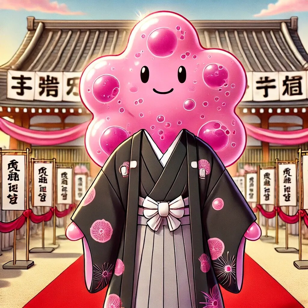 成人体型になった「ももほうくん」が紋付袴をしっかり着こなしていて、成人の日の特別な雰囲気を感じさせます。😊🎉