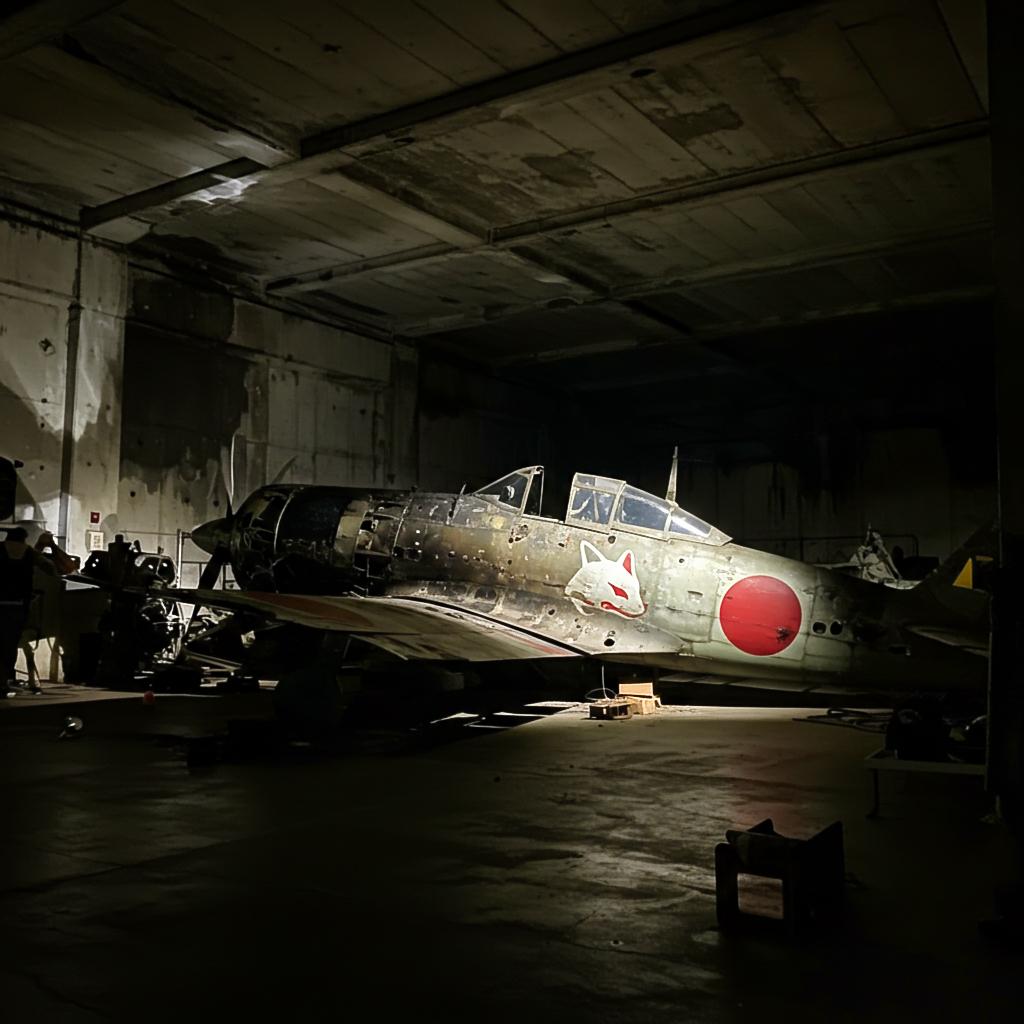 懐中電灯の灯りを頼りに幾つかの部屋の調べつつ狭い通路進んでいくと、大きな鉄扉が現れた。重い扉を開けて中に入ると、そこは湿った空気が広がる広大なコンクリート空間だった。懐中電灯を向けたその奥に残された金属片と焼け焦げた機体の一部が浮かび上がった。赤錆に覆われていたが、機体に描かれた白い狐の絵だけは、辛うじて原型を留めていた。