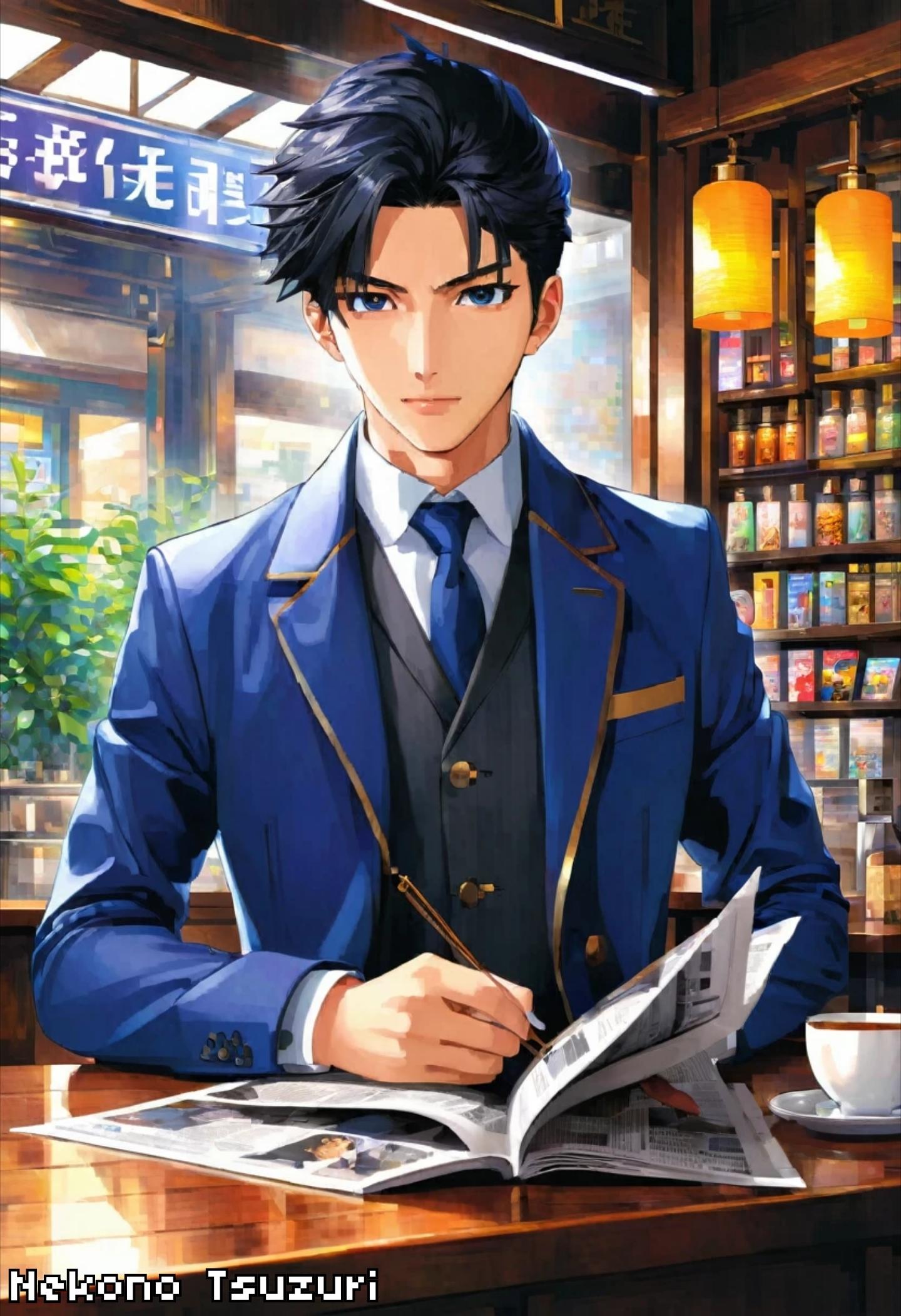 彼目の前で珈琲と新聞紙を見ている彼は、