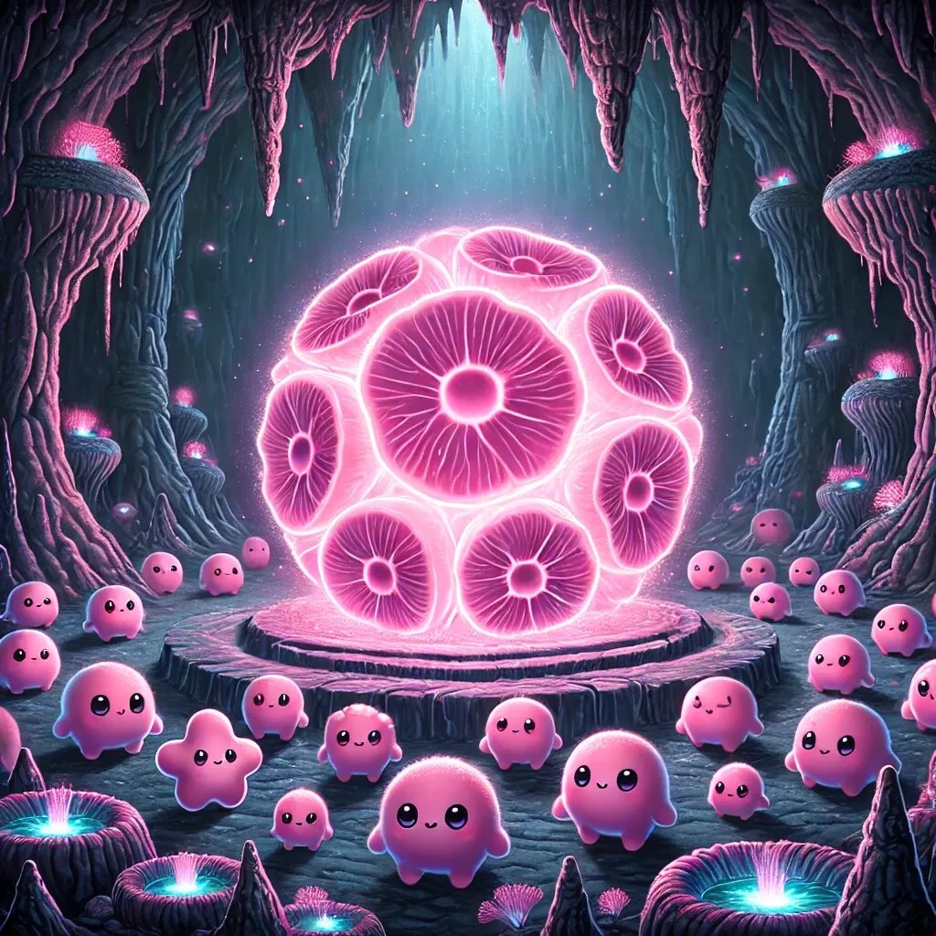 この「桃色生体細胞の中核」は、まさに「ももほうくん」たちの親のような存在であり、彼らの生まれた源として神秘的な雰囲気を醸し出しています。🍑🌟