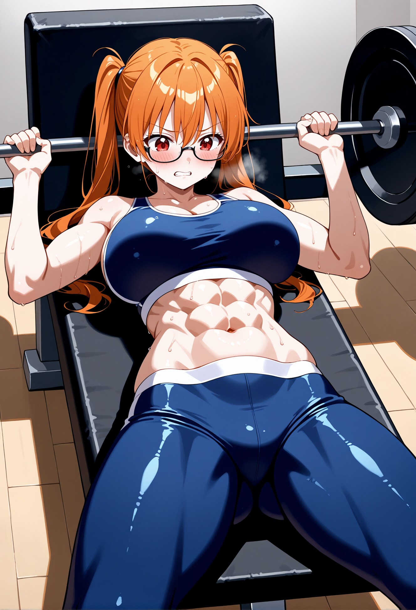想像以上の重さに額に汗を浮かべ、苦悶の表情でバーを押し上げる真菜