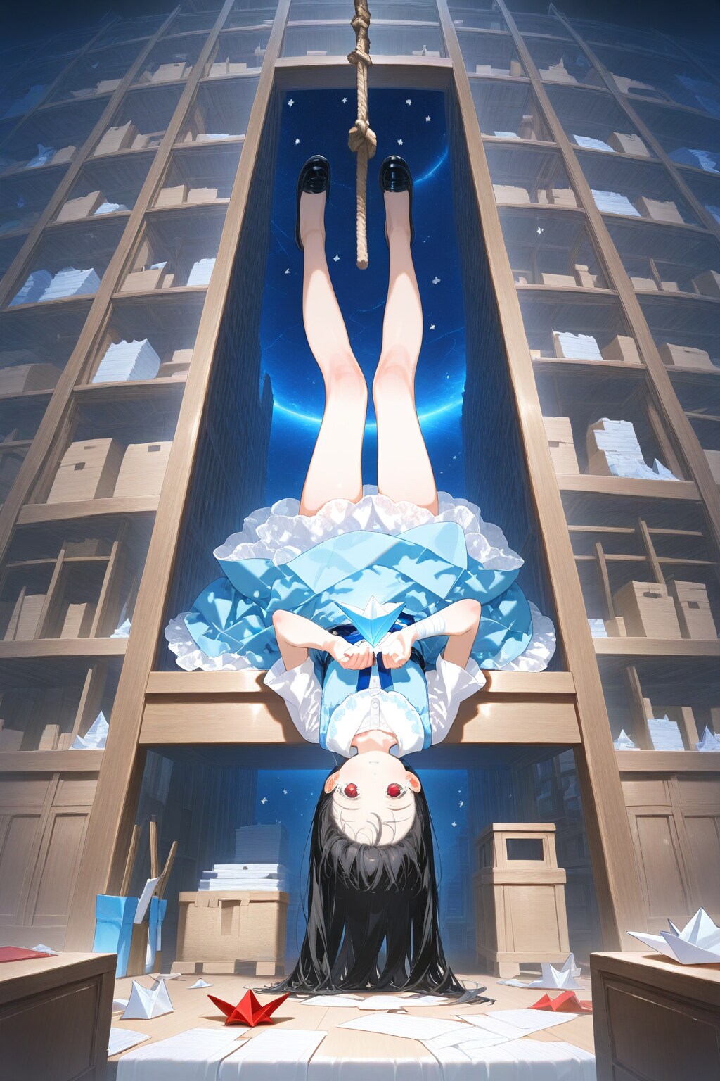 逆さ吊りのイラスト生成は難易度が高く、作画崩壊したり、左手が右手だったり、思い通りのイラストにならなかったり大変だったと思います。