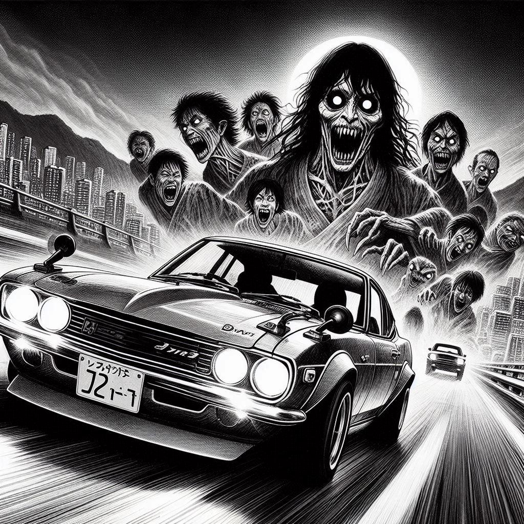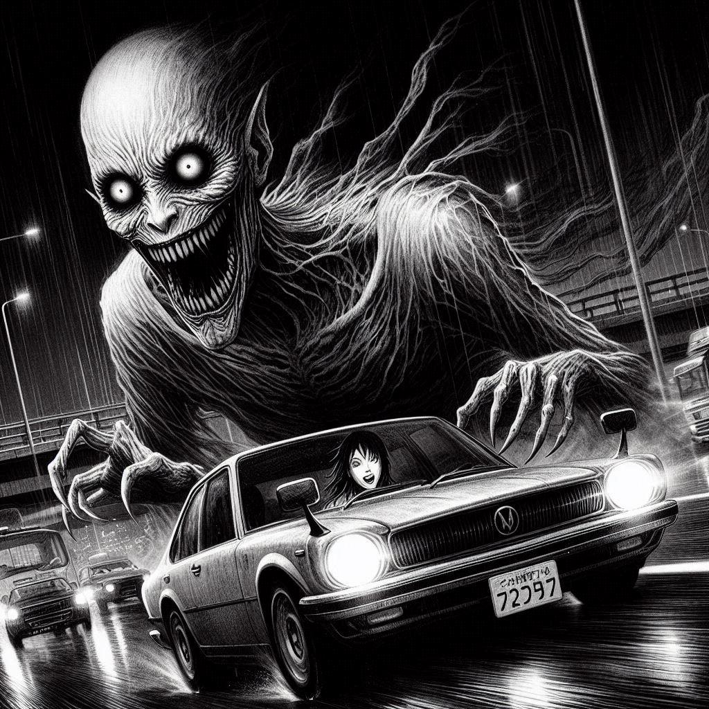 生前は、自業自得の悪質ドライバーで自分の危険運転で勝手に〇んだのに、楽しくドライブしている人達を勝手に恨む邪悪な悪質ドライバーの怨念(大きい怪物は怨念の集合体)!って脳内設定のイラストです。
