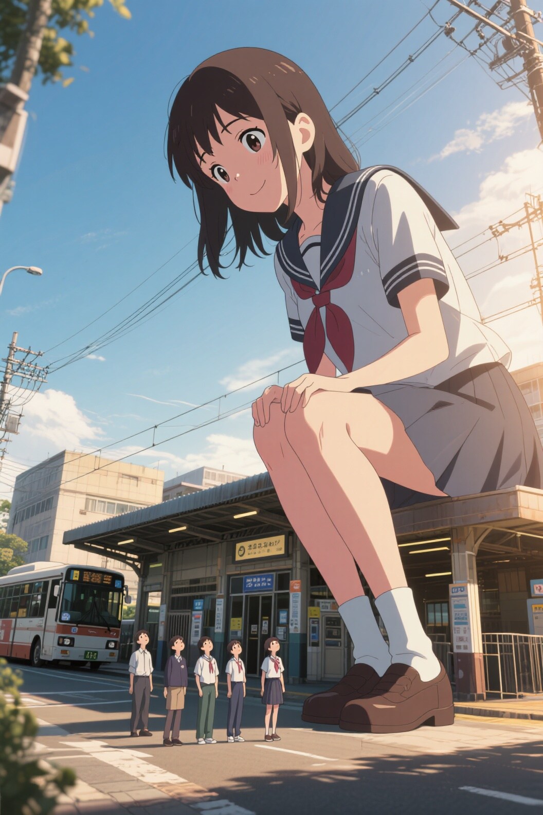 セーラー服の襟が、ビルの屋上をかすめて揺れている。