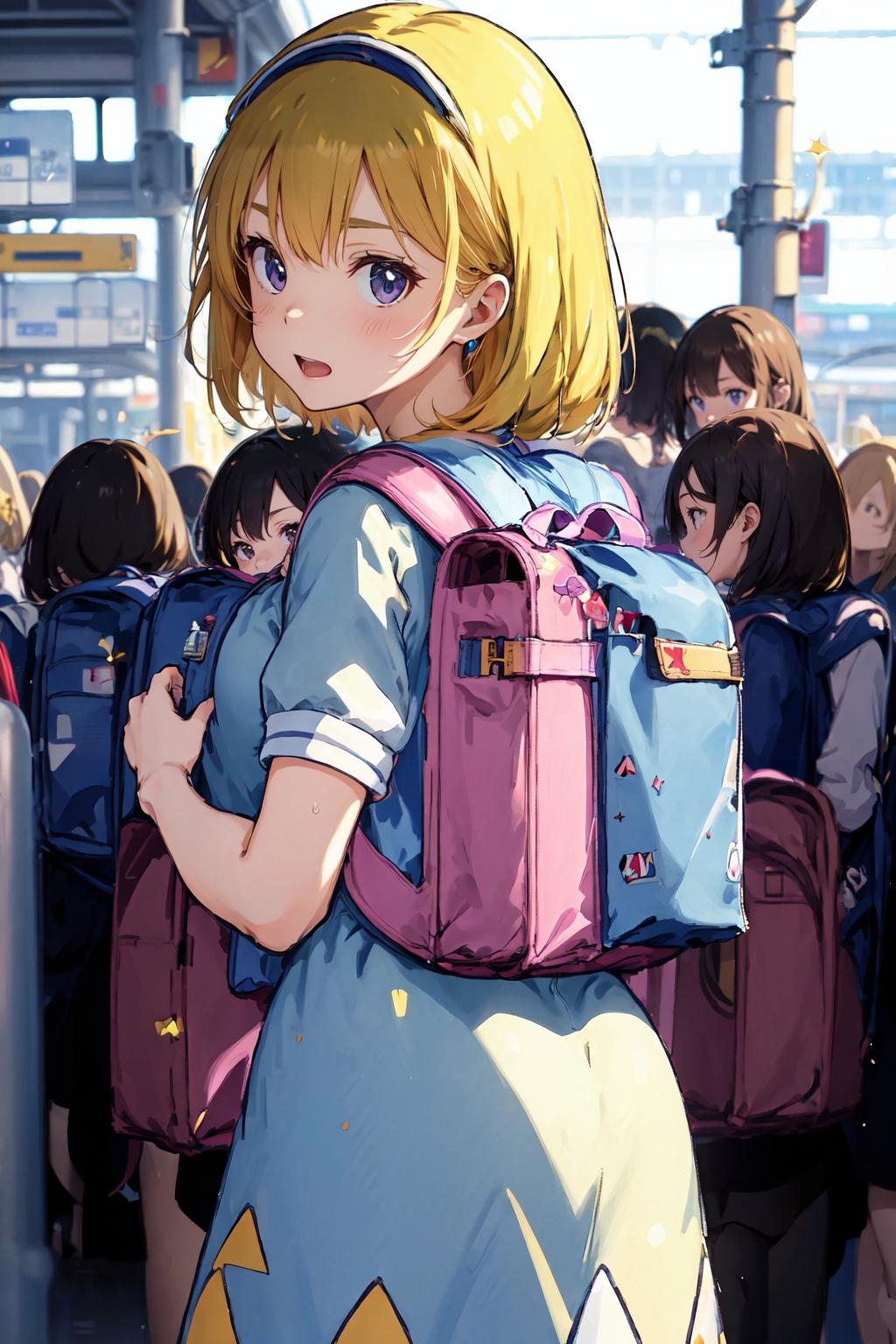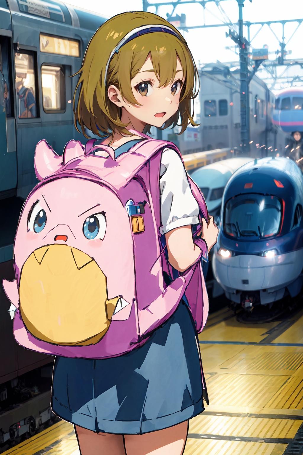 プロンプトは、2枚目のものです。リュックに張り付いているのは、ウクライナからついてきた、おせっかいなもん吉くんです!お休みの日は一緒に電車を見て回ります😊