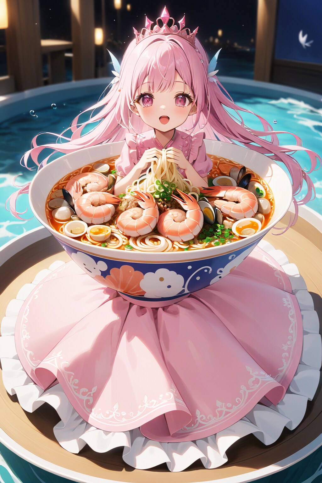 (なお、SDXLモデルはプロンプトの効きがいいせいか、フラットな状態では姫ドレスが消し飛んで海鮮麺さんだけになったため、泣く泣く強調をかけました)