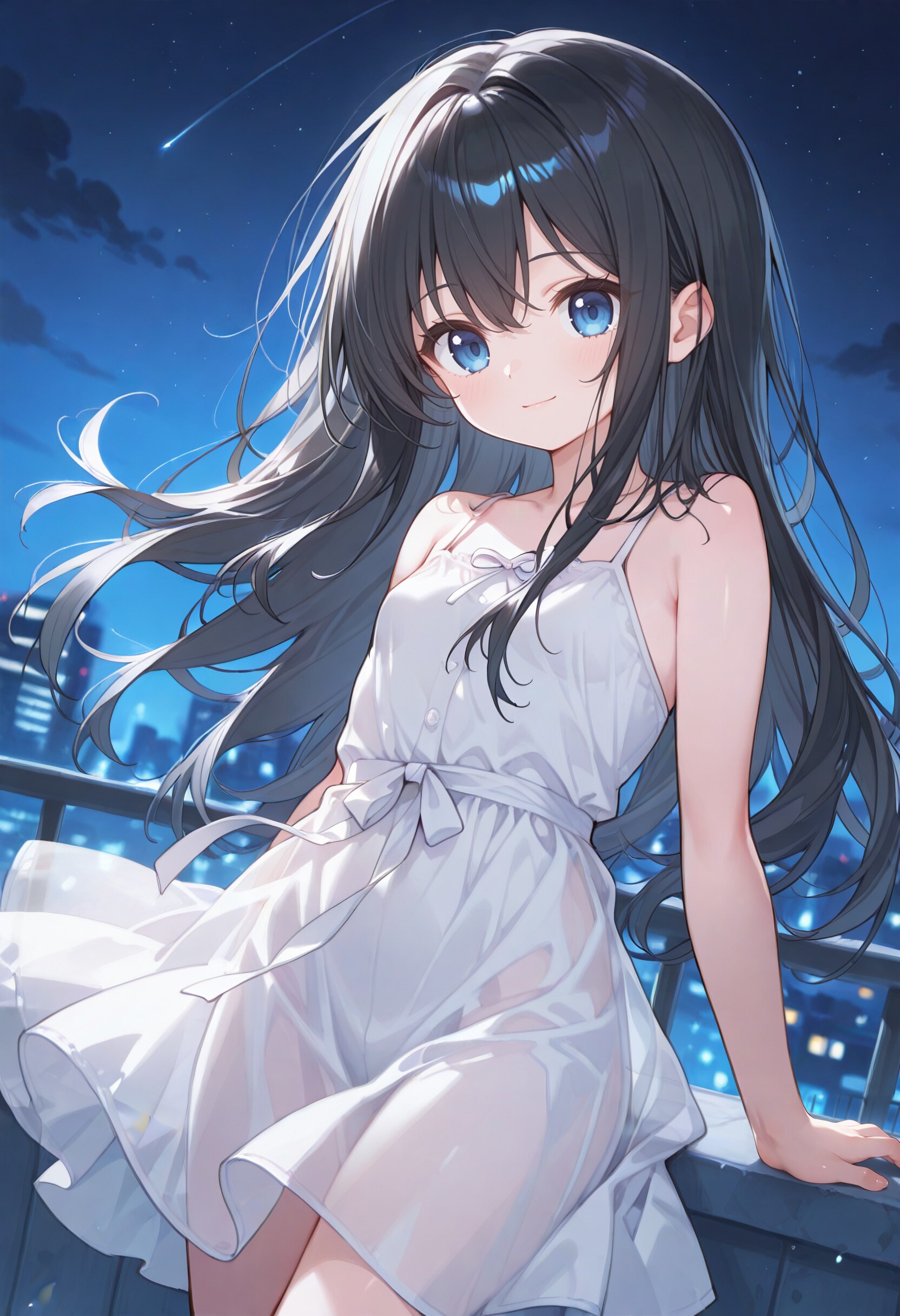 【特徴:黒髪、ロングヘア、髪・瞳のハイライト強め、スレンダー体型、白ワンピース(透け感重視)】