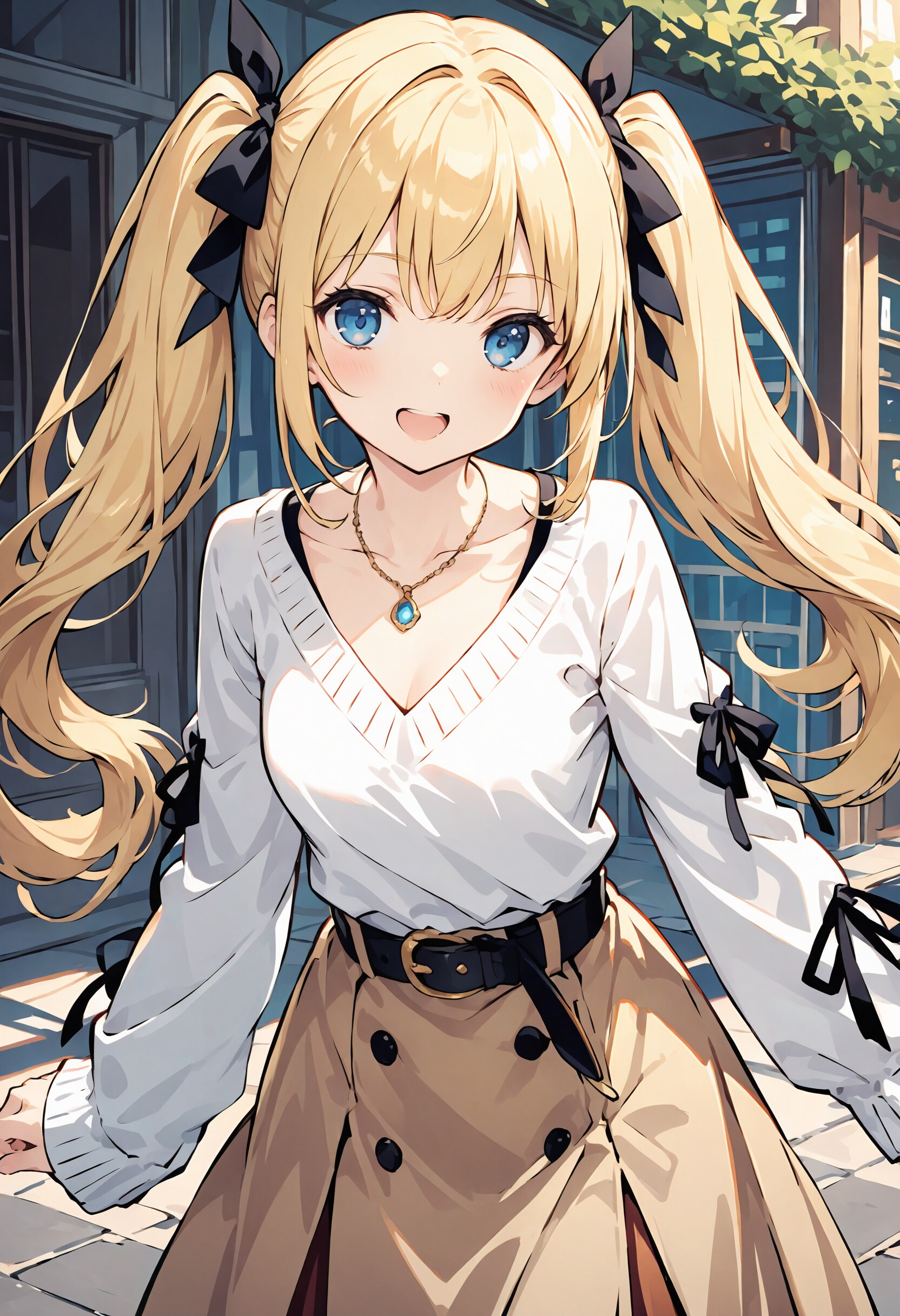 v neck sweater, ribbon decorated sleeves, trench skirt, front buttons skirt, belt,