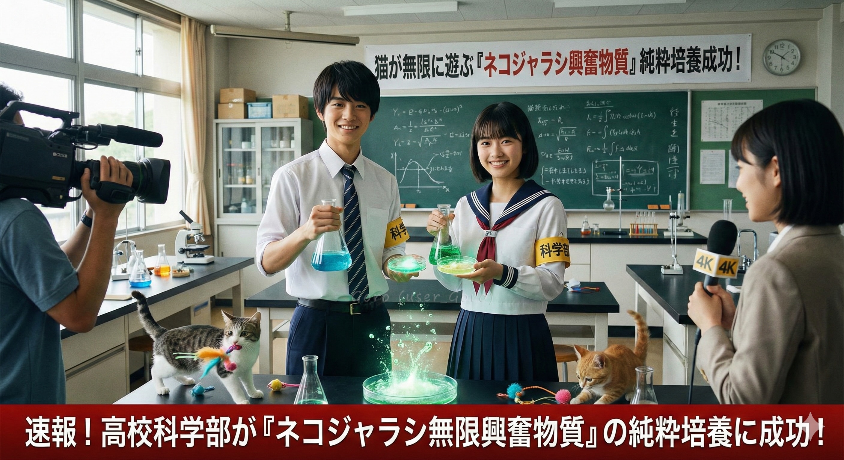 「猫じゃらしの興奮物質の純粋培養」に成功したと、テレビの取材を受けていた。