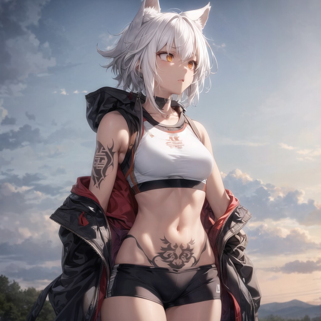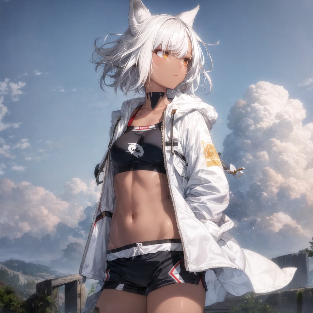 羽飾りや入れ墨とかトライブっぽい格好もさせてみたかったのですがなかなか難しかったので、人間の街でも普段から着ているであろうアスリートっぽい格好をしてもらいました。それっぽい柄がいろいろ出てくれますね。