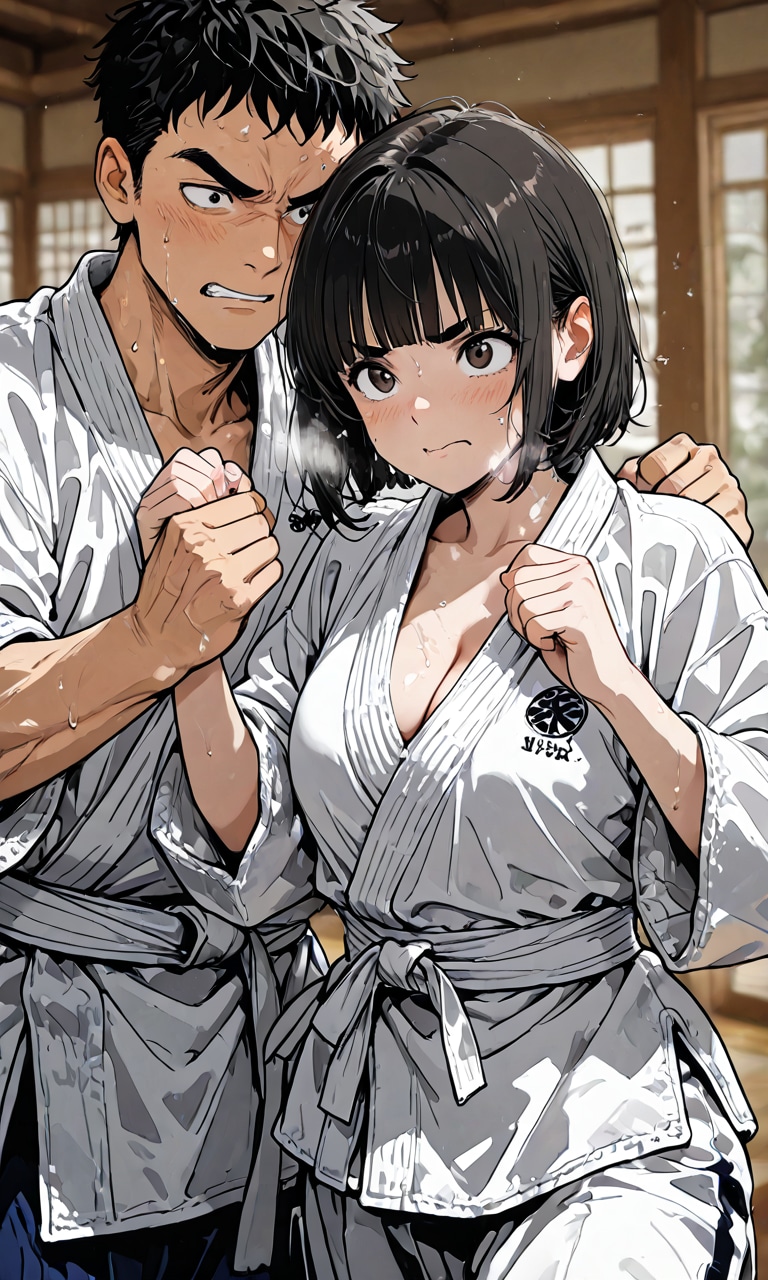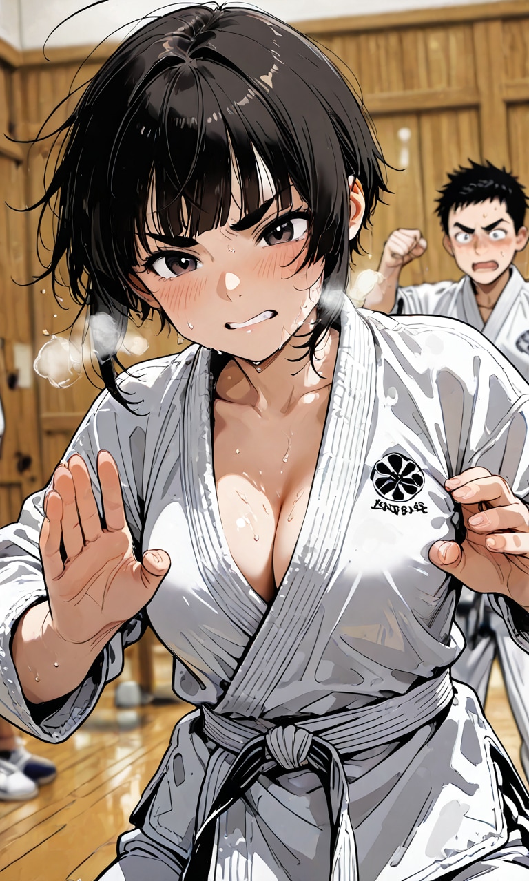 女の子は普通は道着の下に着ているTシャツも無しで、この投稿のように谷間が見える状態でした。