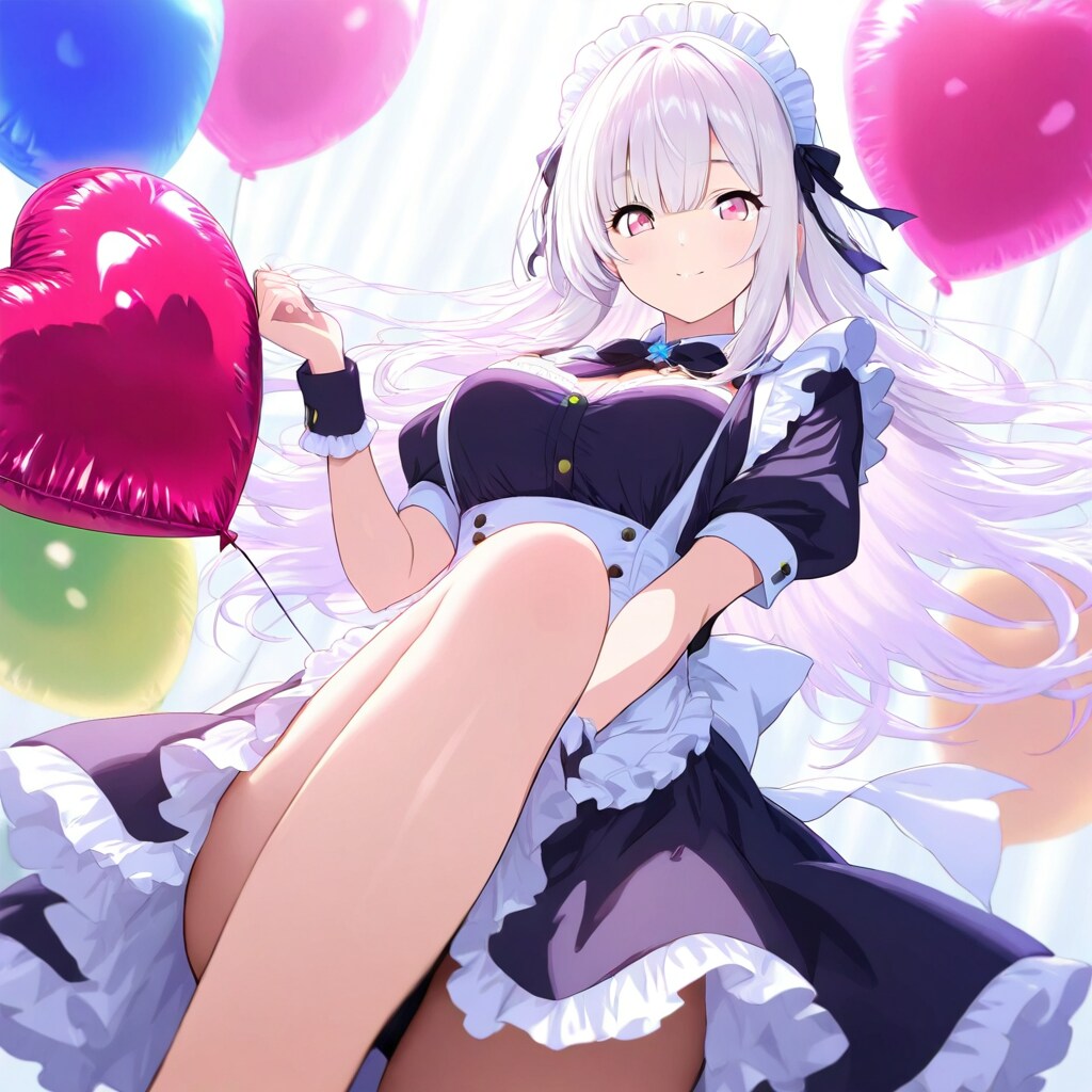 いっぱい風船を持つ白い髪ロングのメイド服の美女。