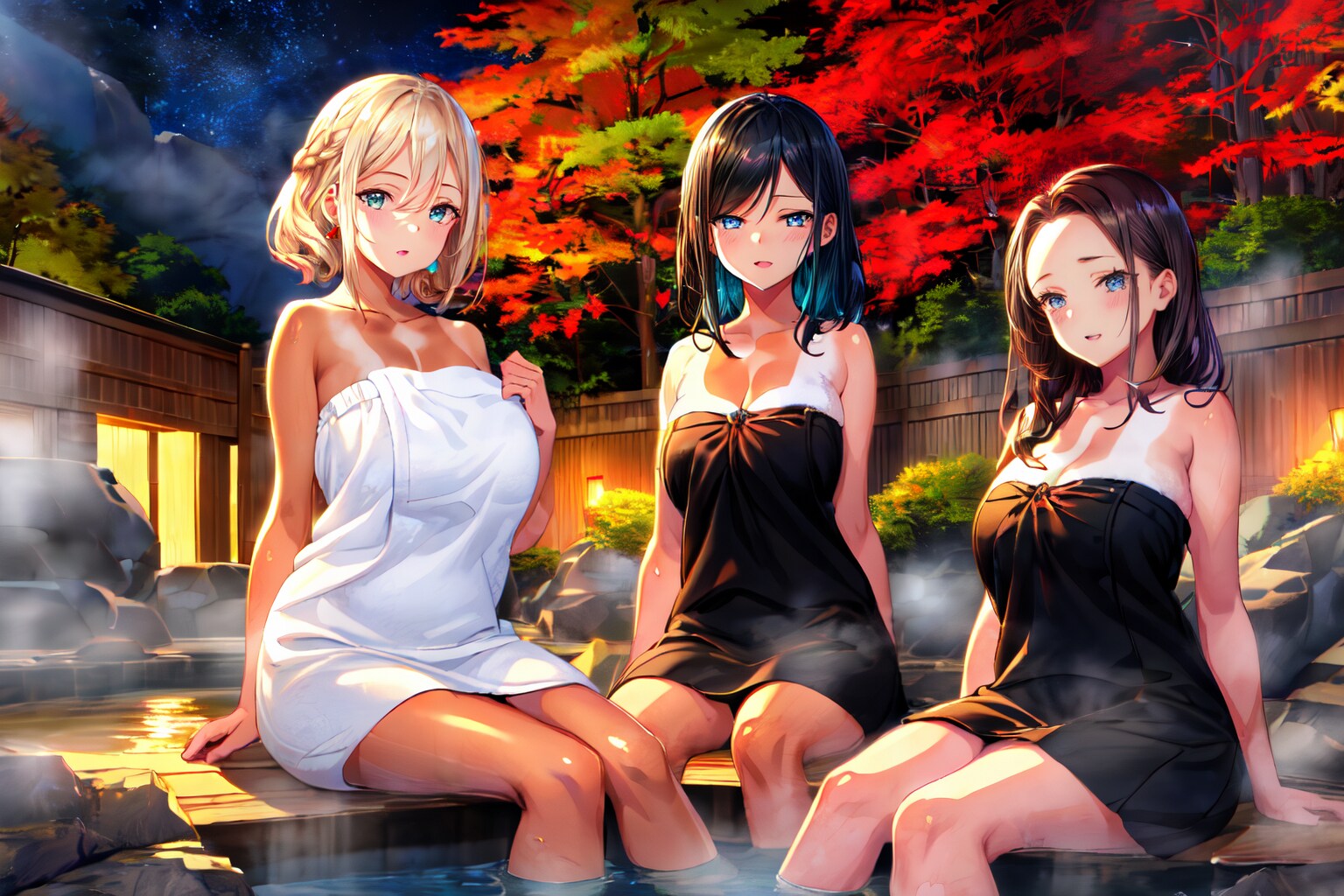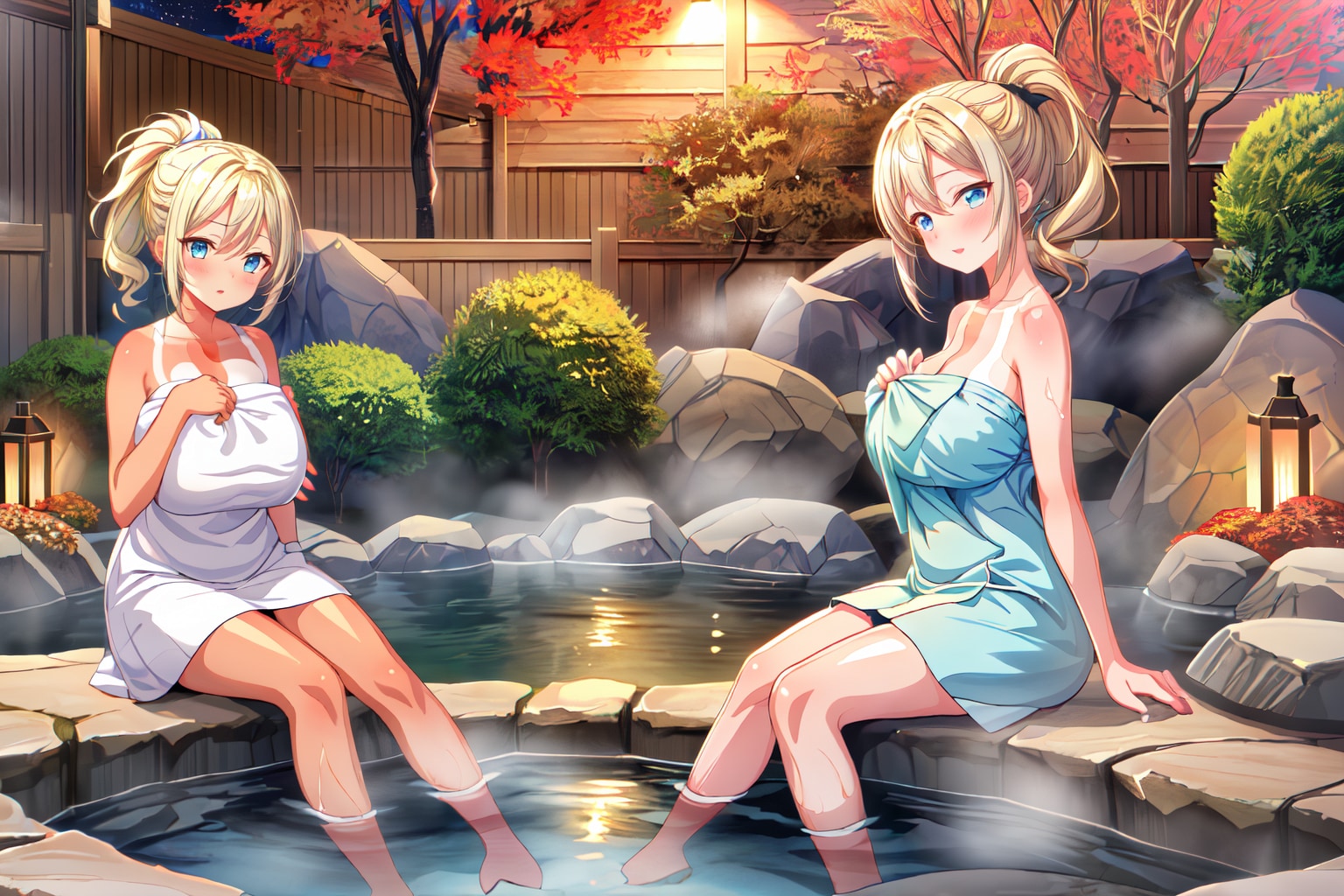 友達と温泉で入浴して会話している場面をイメージして生成してみました。