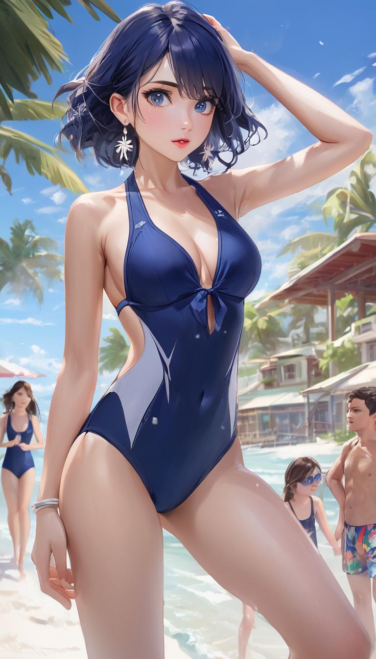 (navy blue school swimsuit:1.2),Plain swimsuit,(Attractive Mature Women:1.2),Island Resort ,Beach,palm tree,
