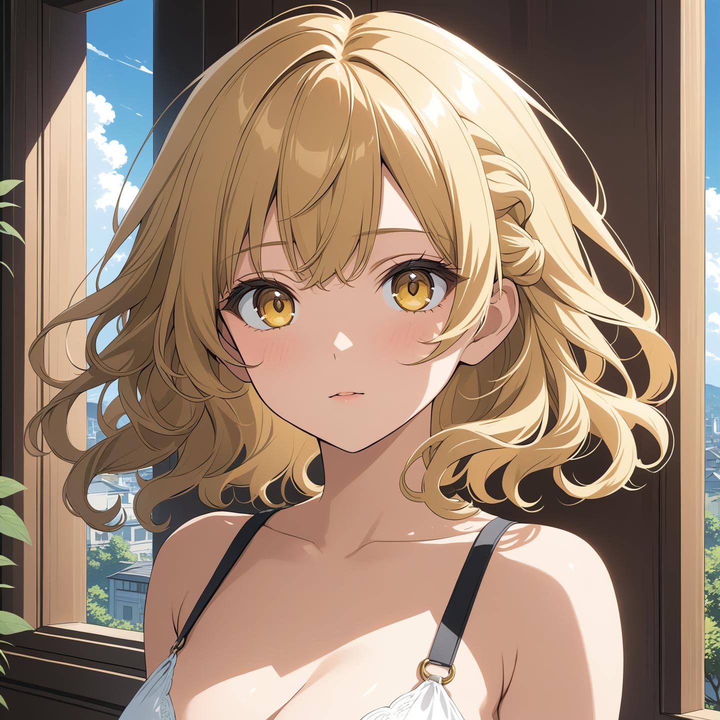 blonde hair,medium hair,yellow eyes,wavy hair,medium breasts