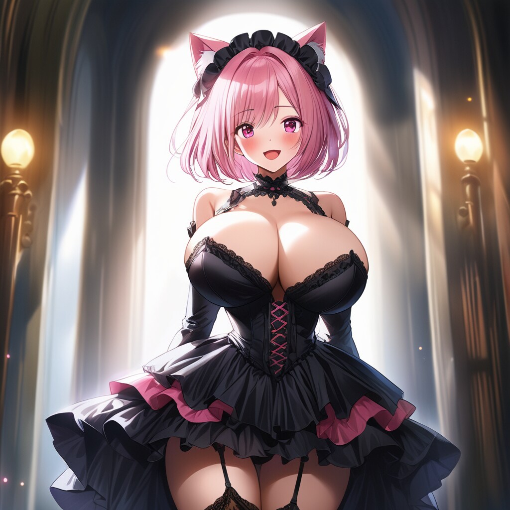 セクシー系ゴシックロリータファッションのブラックピンク系猫耳爆乳美女