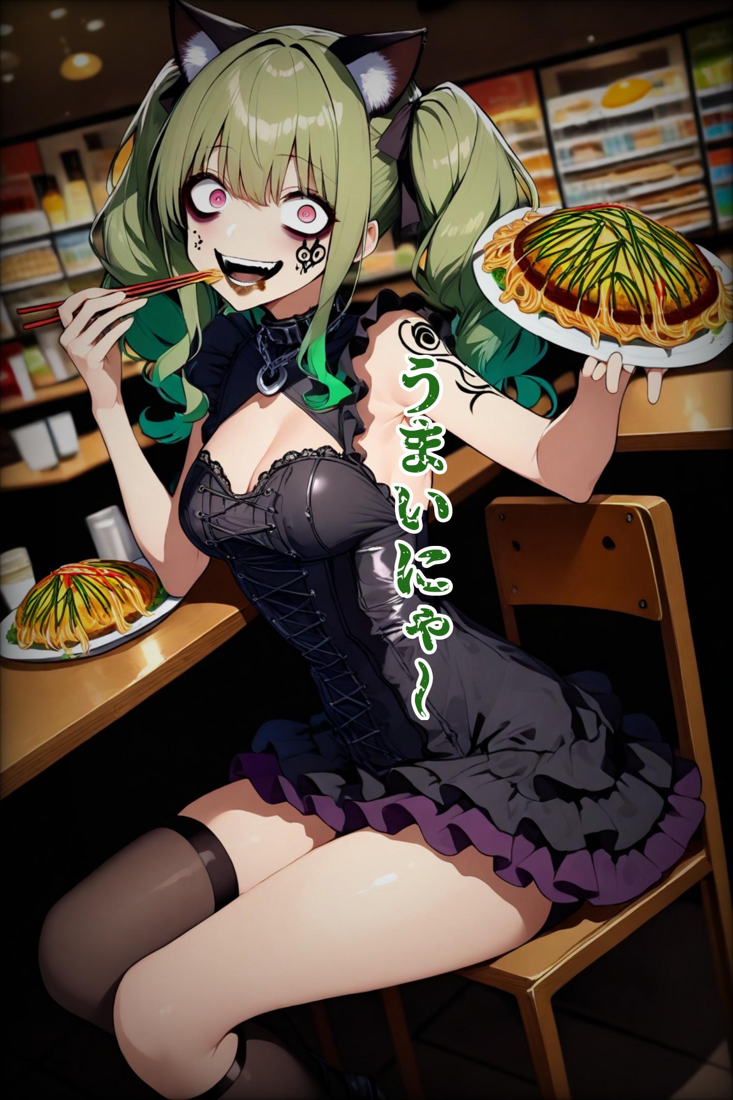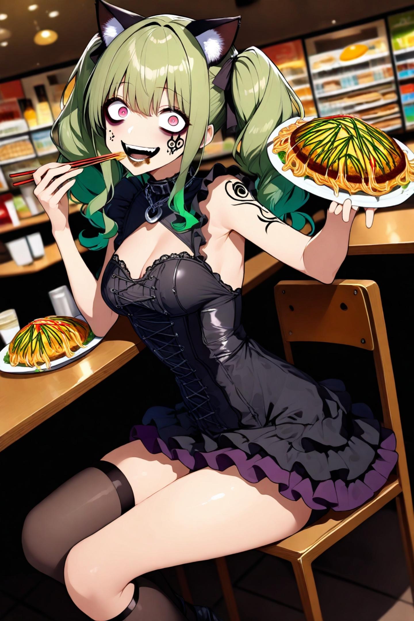 彼女は虎崎ススメの店でお好み焼きを食す。