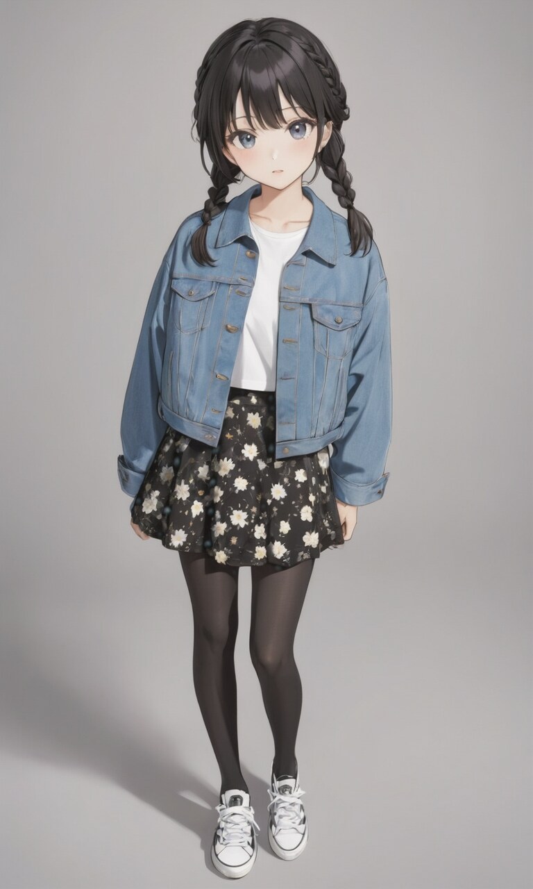 デニムジャケットにシンプルな白Tシャツ、花柄のスカートに黒のストッキング、足はローカットのスニーカー(converse)。
