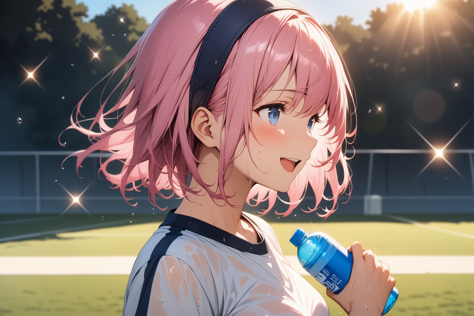 「学校のグラウンドで水分補給をする少女」を表現してもらいました。こんな感じに。