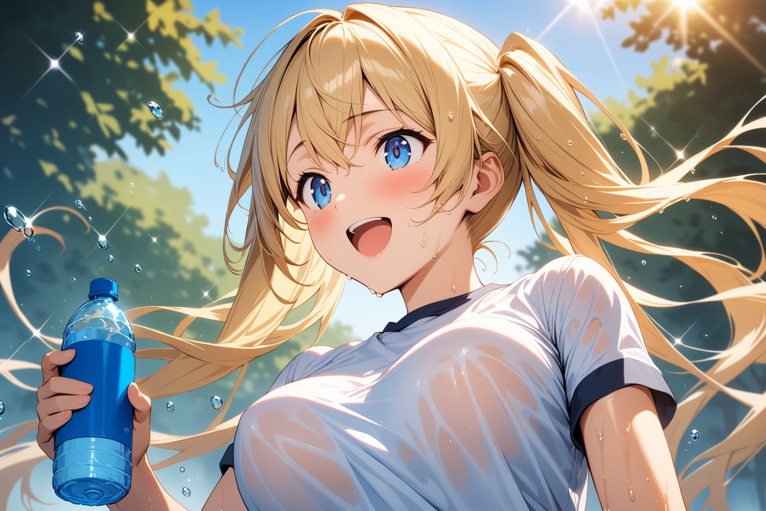 真夏の日差しが照りつける学校のグラウンドで、一人の少女が水道の蛇口をひねり、冷たい水が勢いよく噴き出します。彼女は楽しそうに笑いながら、水筒の水を飲んでいます。体操服は水に濡れて少し透けて見え、髪の毛は水滴がキラキラと光を反射しています。