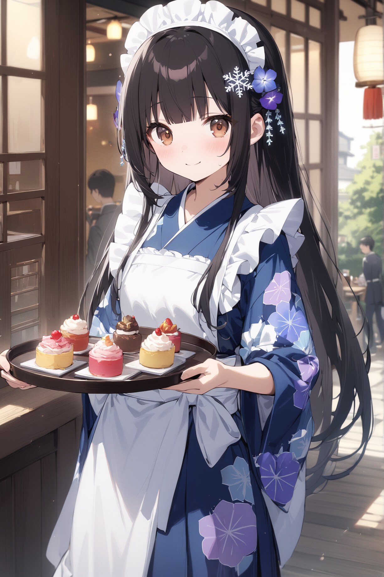 ・japanese maid と (色指定) kimono を両方指定しています。着物っぽくなる時もあればメイド服っぽくなる時もありますが、採用したこちらは着物要素もあるけどメイド服の方が強かったものですね。夏らしく半袖で濃い青のものにしてみました。