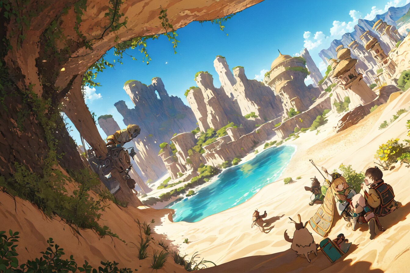 訳:神秘的な砂漠を旅していると、一行は移動して渦を巻く感覚を持った砂丘に遭遇し、古代の埋もれた宝物へと彼らを導きました。