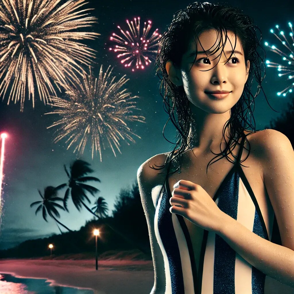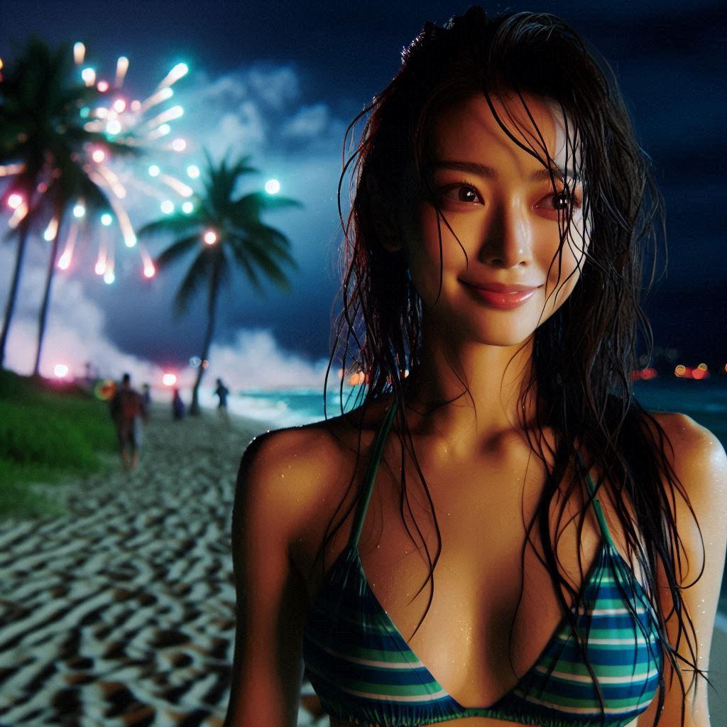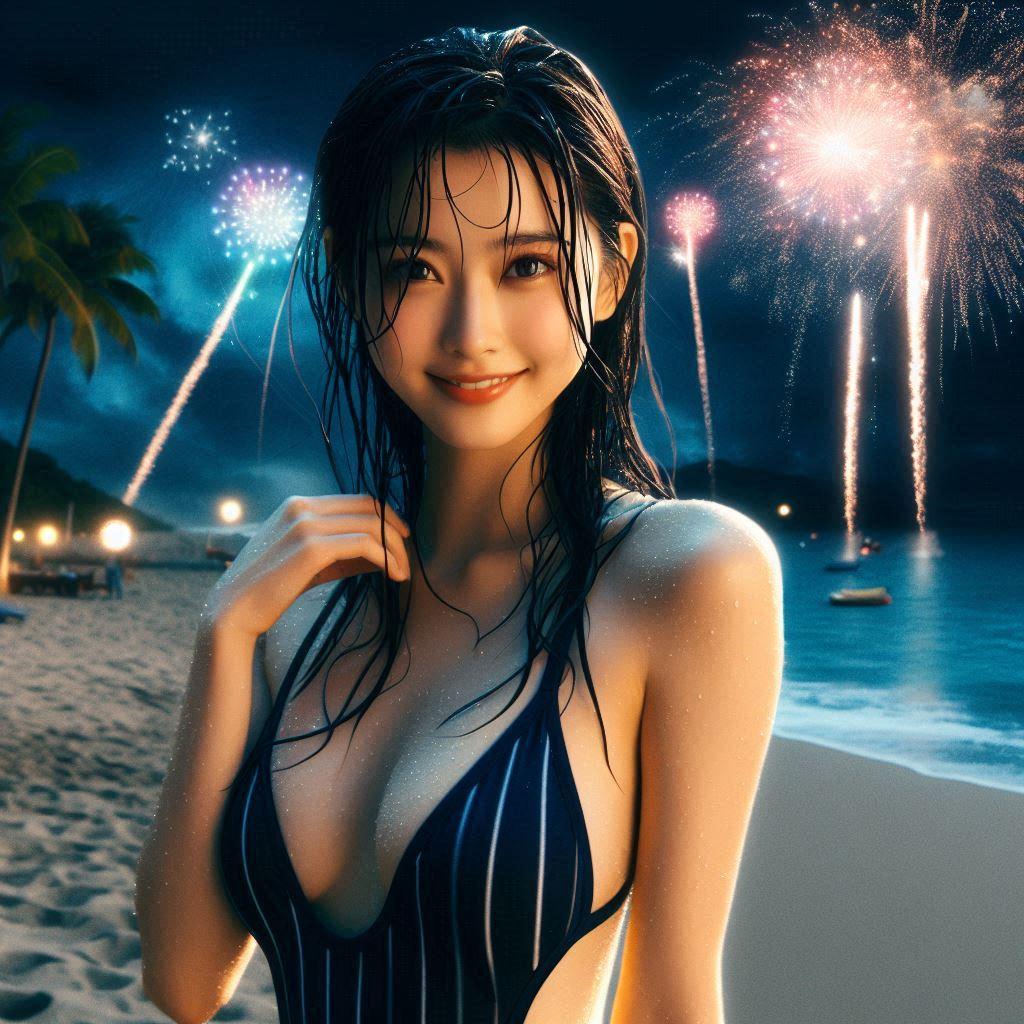夜スイムを終えて砂浜に上がった水着美女の背後で始まる花火大会