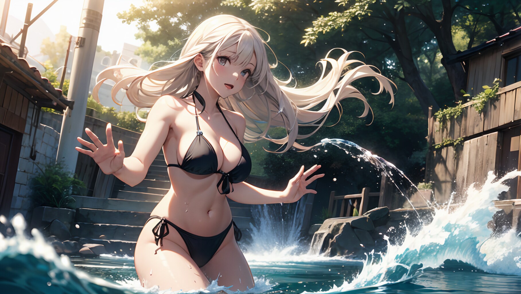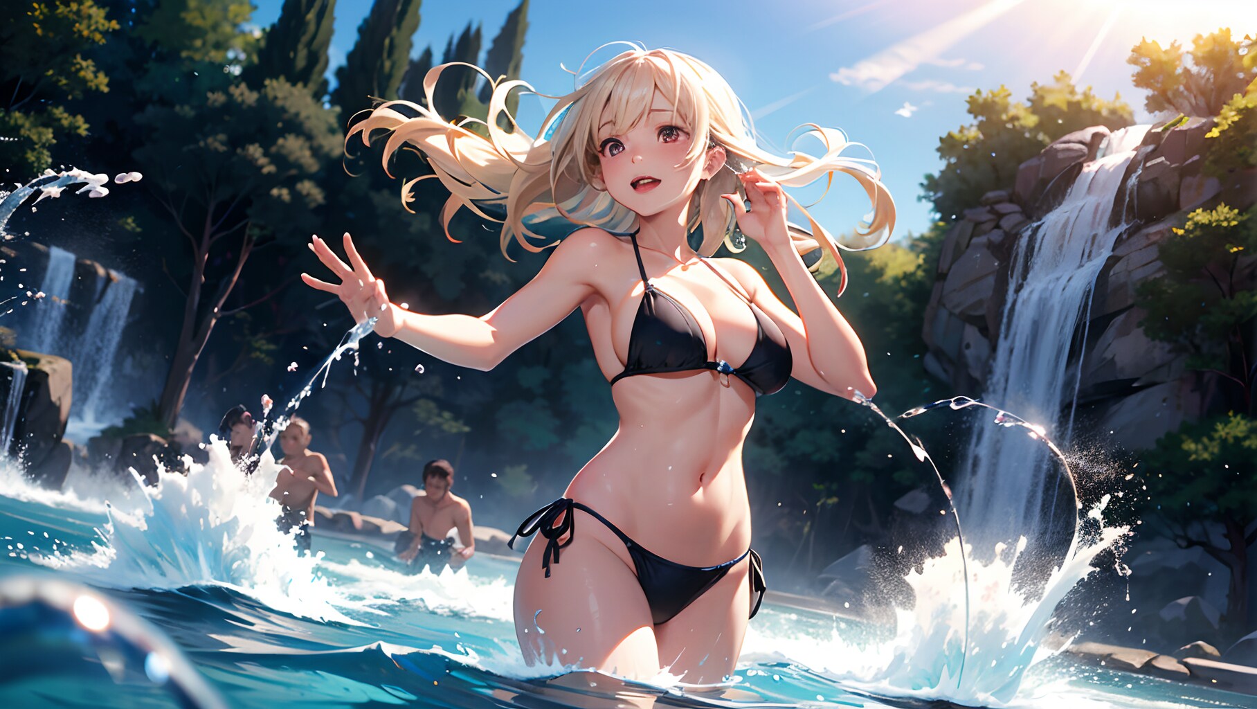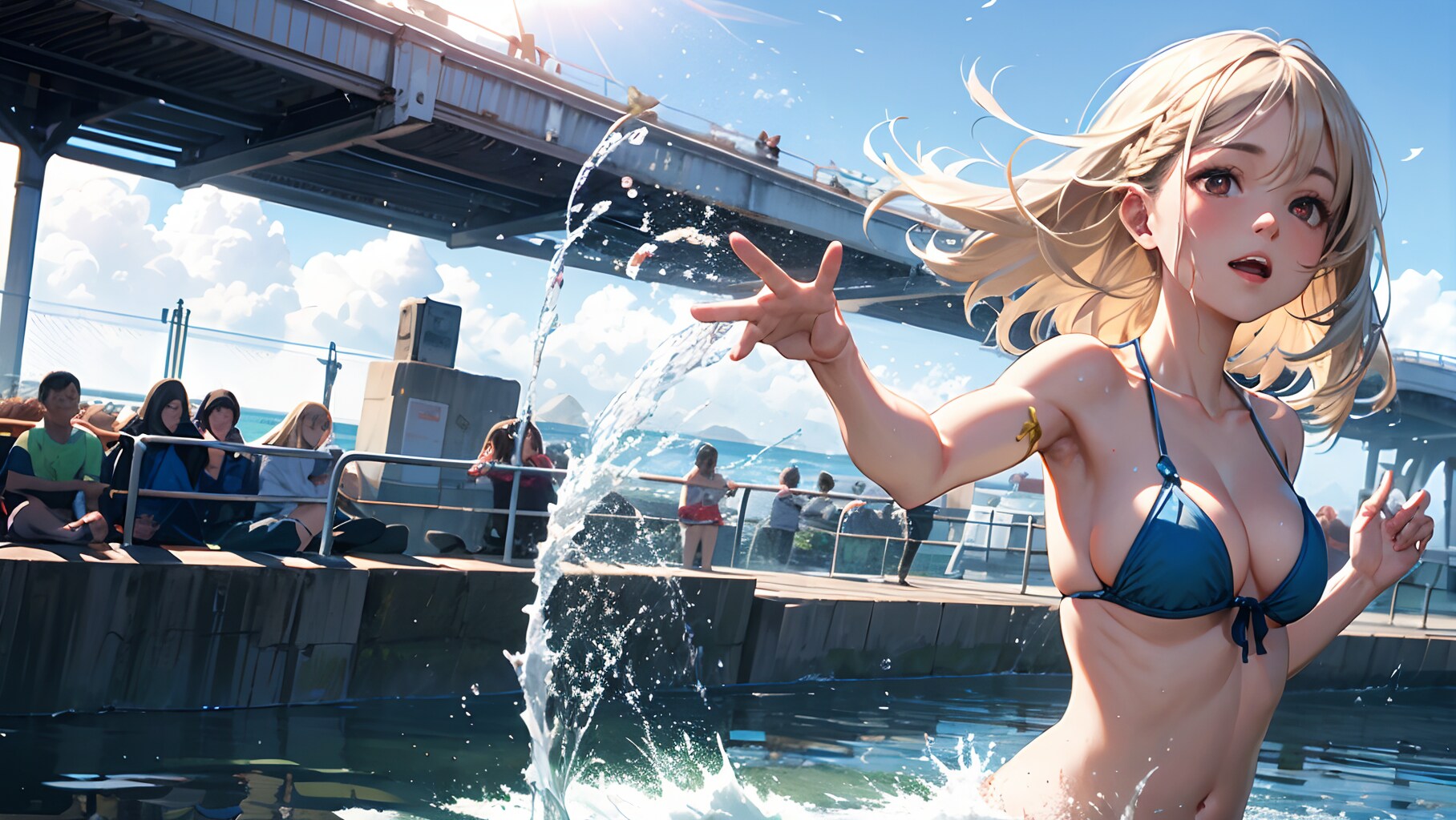 女の子が水を掛けてくるようなシートは結構前からコンセプトととしてはあったのですが、宙を舞う水を描くのがかなり難しく、なかなかいい絵にならず色々試してました。