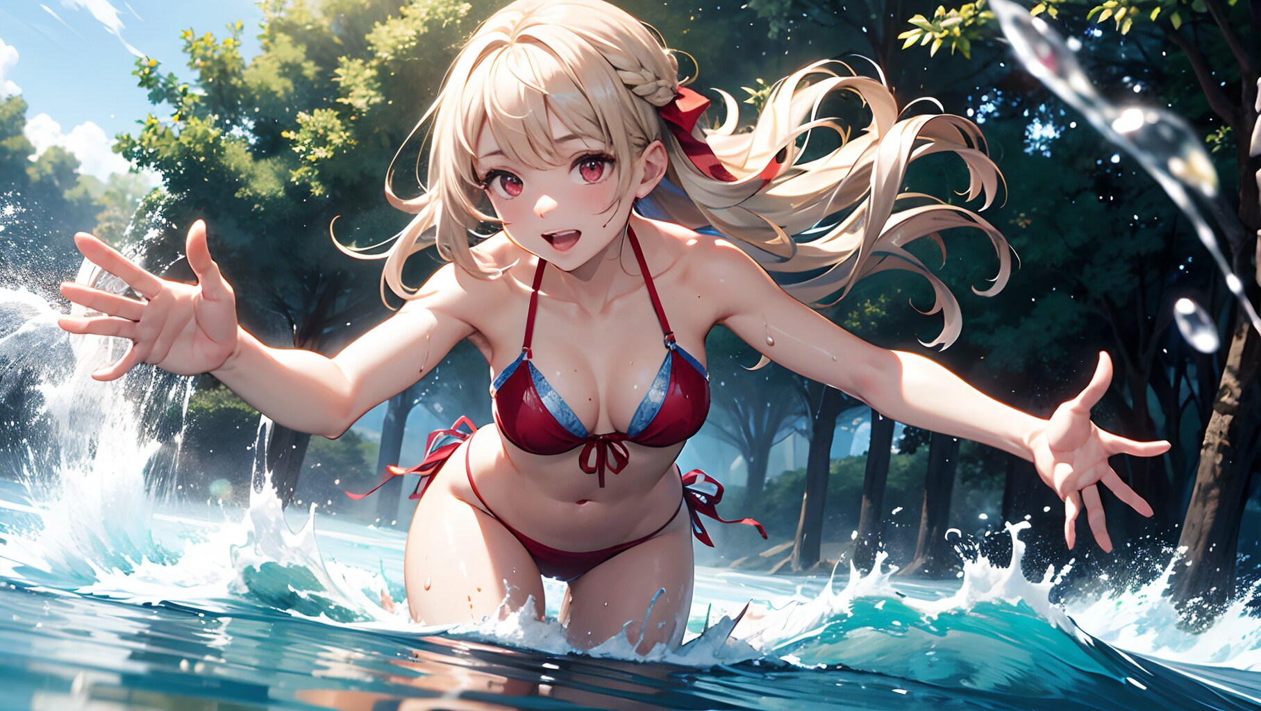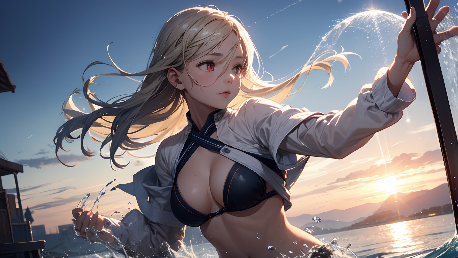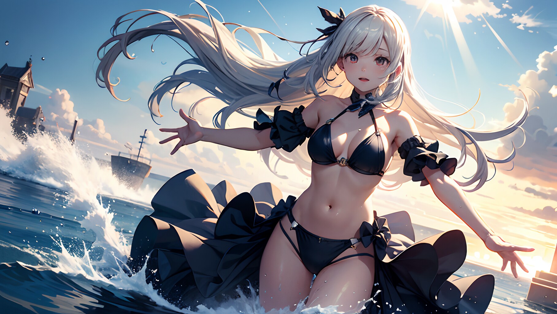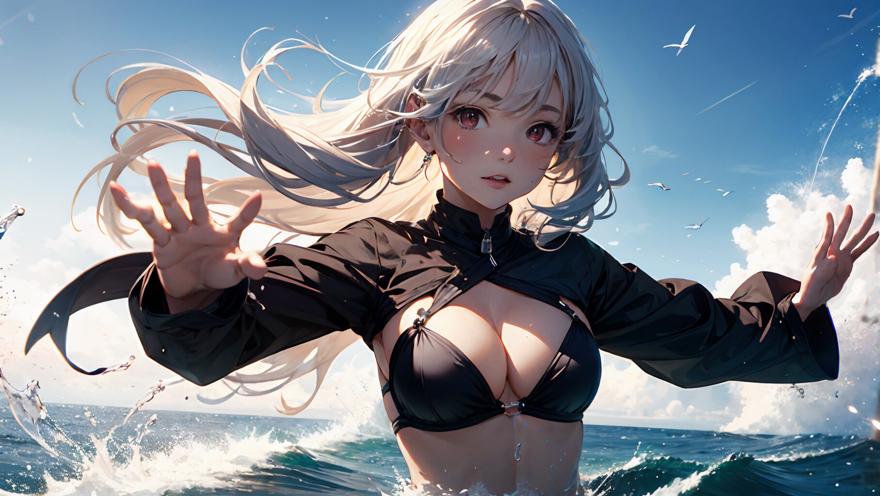 女の子が水を掛けてくるようなシートは結構前からコンセプトととしてはあったのですが、宙を舞う水を描くのがかなり難しく、なかなかいい絵にならず色々試してました。