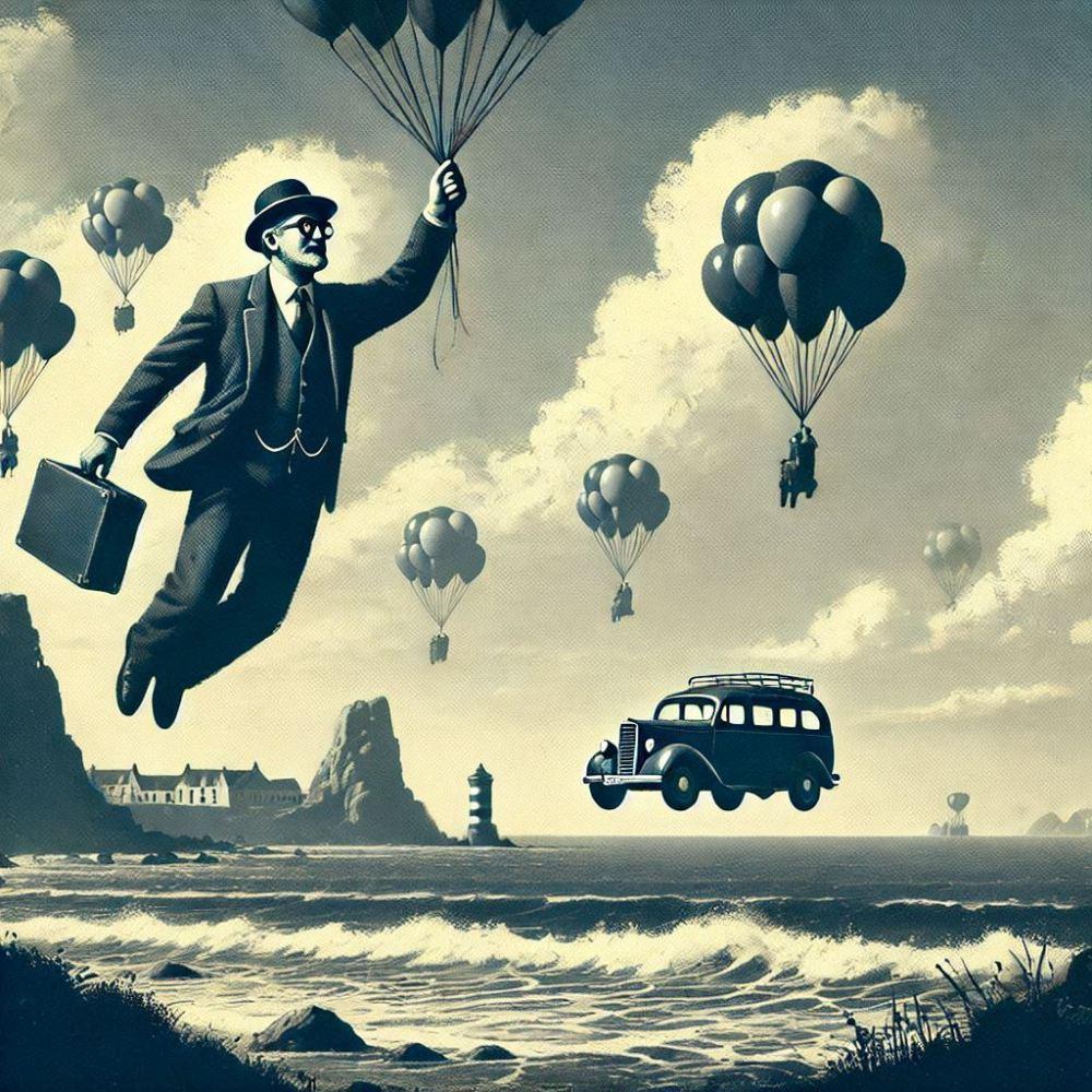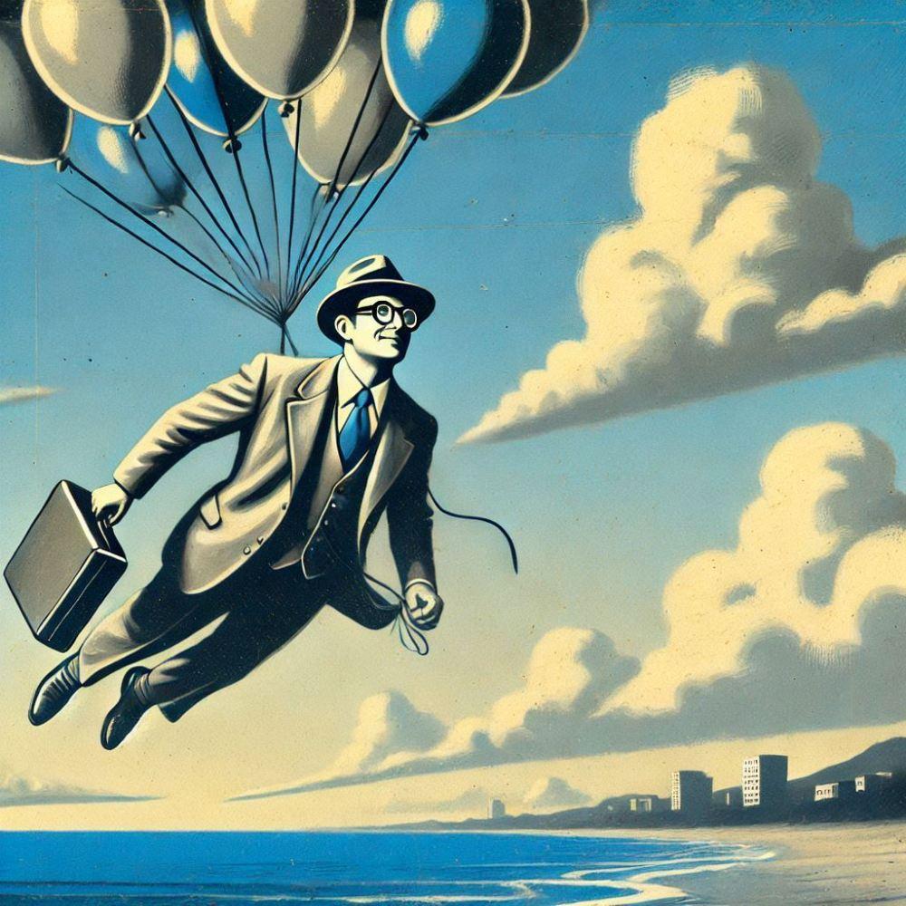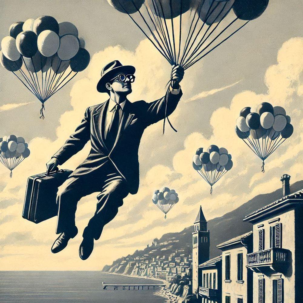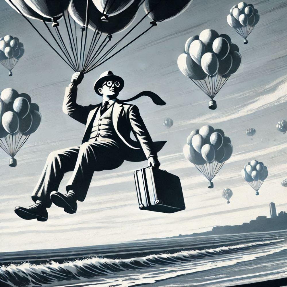 油絵白黒シルエットファンタジー、風船で空を飛ぶサラリーマンのおじさん