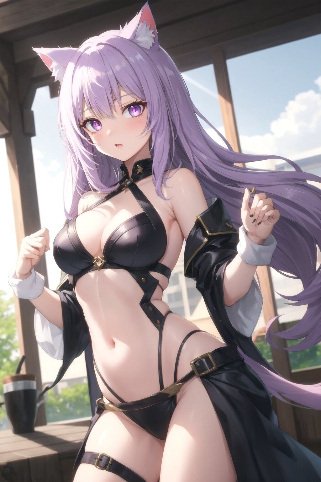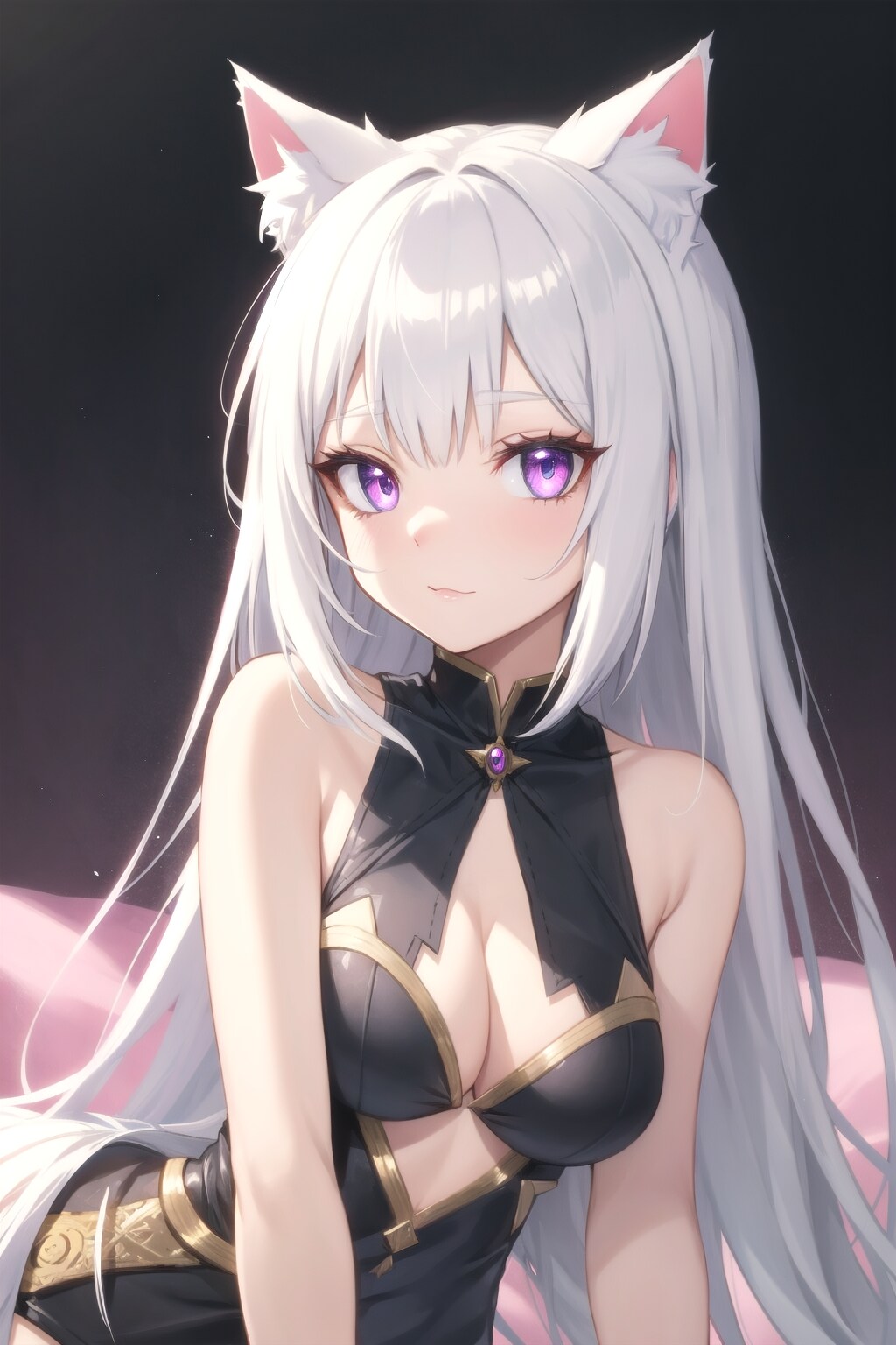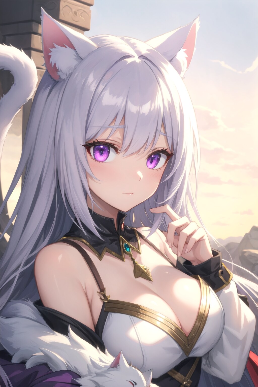 1枚目のプロンプト原文:「ファンタジー、白い雌猫獣人、針の様に細長い猫の瞳孔、猫の耳、紫色の瞳、猫の鼻」