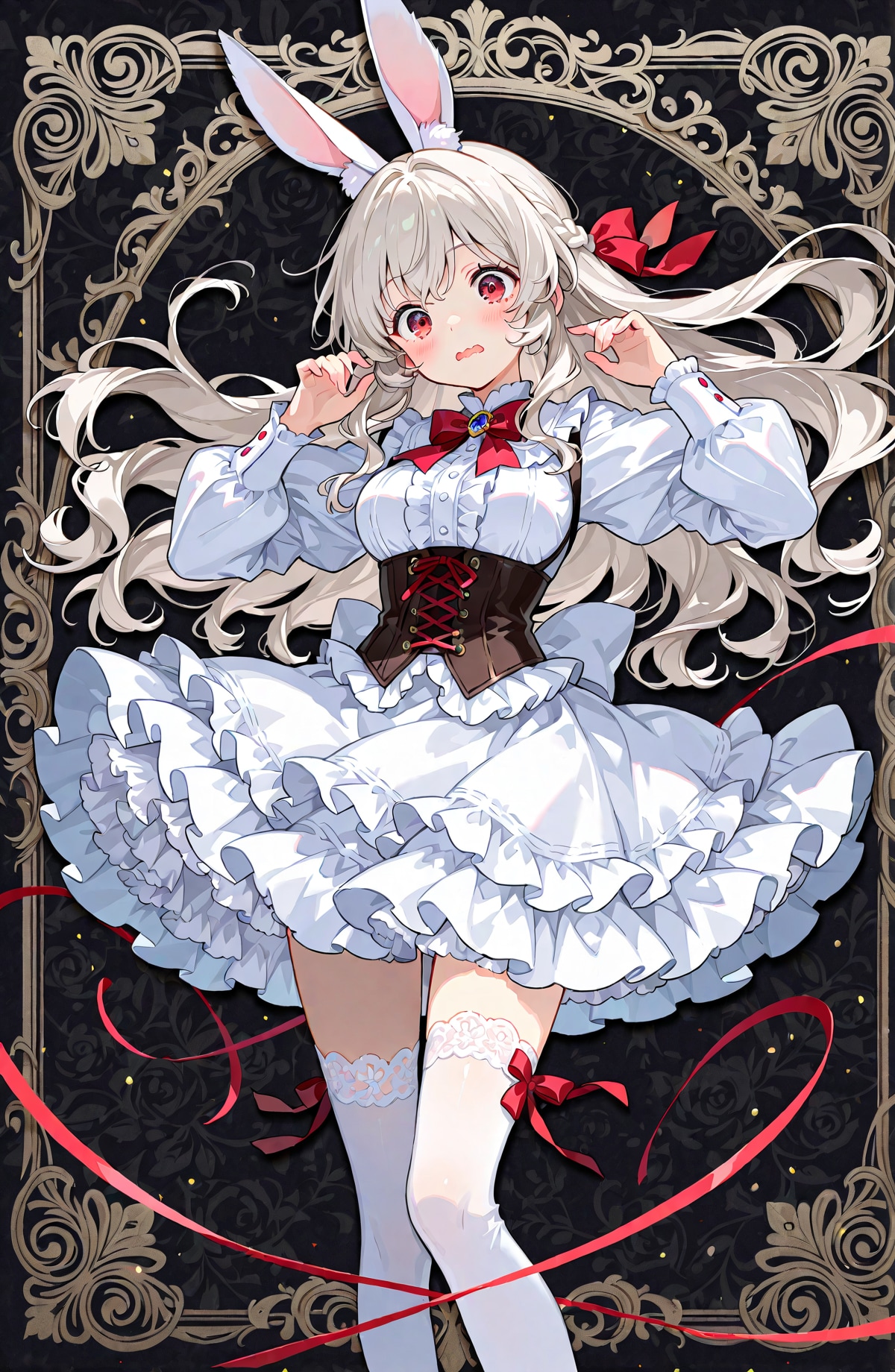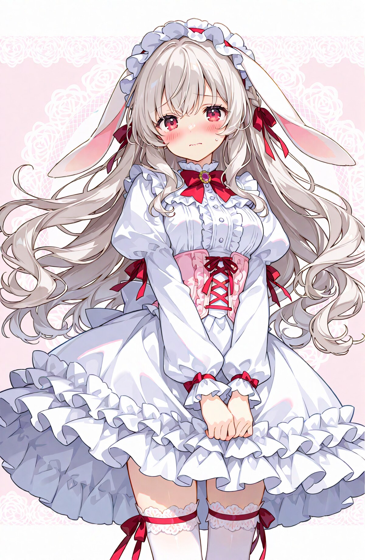 ・前回は地雷系だったので、今回は近いですが白のホワイトロリータということで、服装は white lolita, corset, puffy sleeves, too many frills, lace, zettai ryouiki, knee high socks, たりを指定。背景は風景でなく抽象的にして lace backgroundを 指定しています。