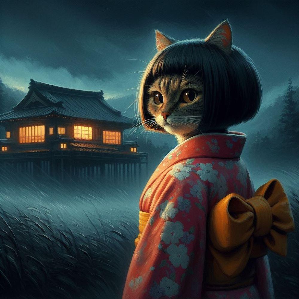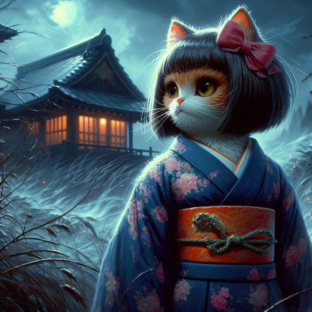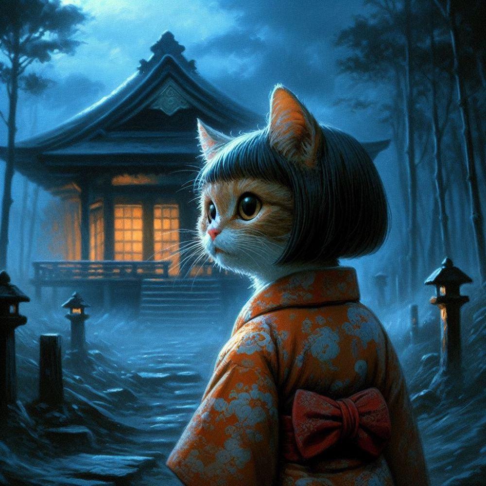 アクリル風 日本のお化け屋敷 #おかっぱ 猫