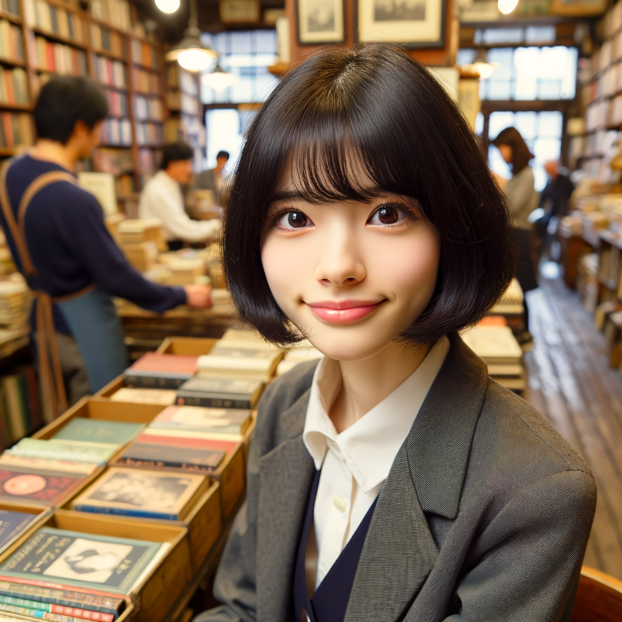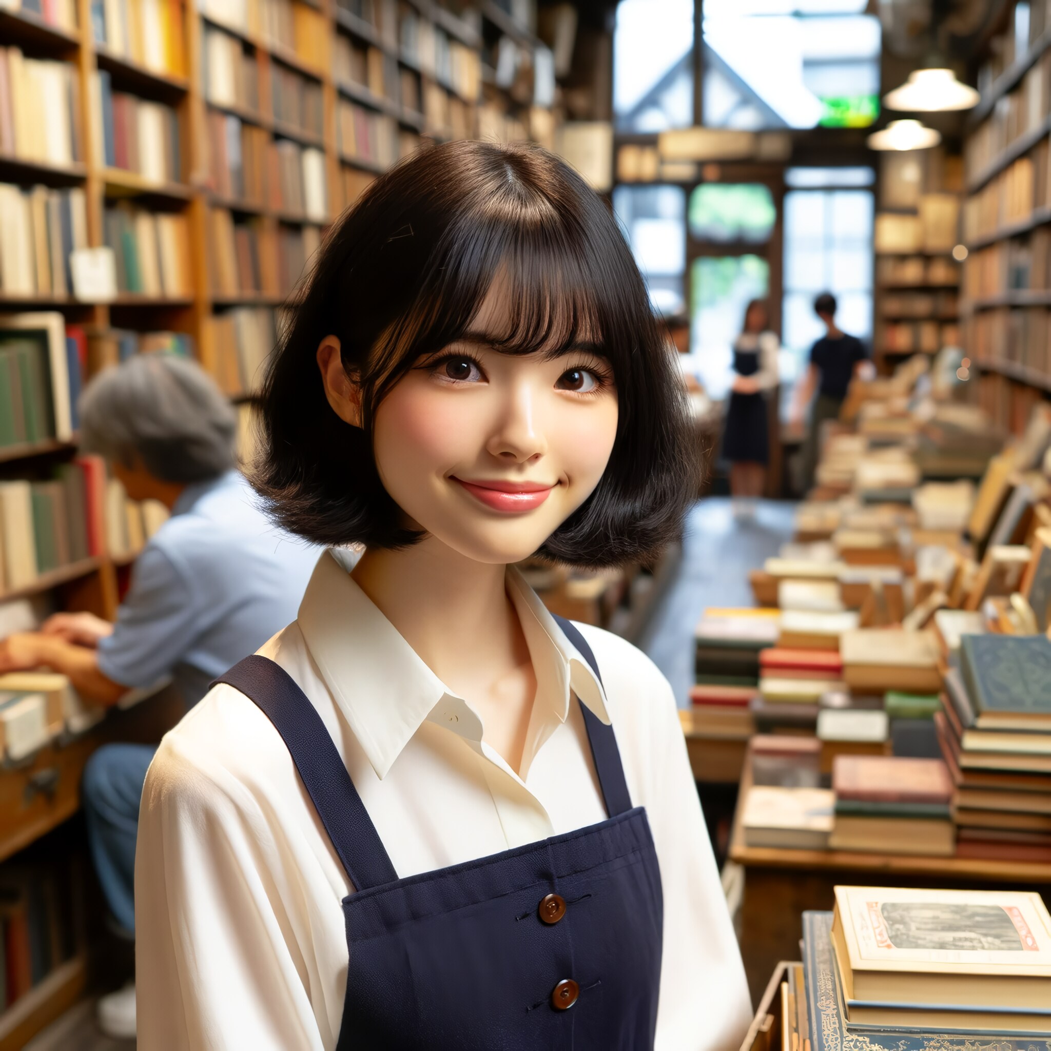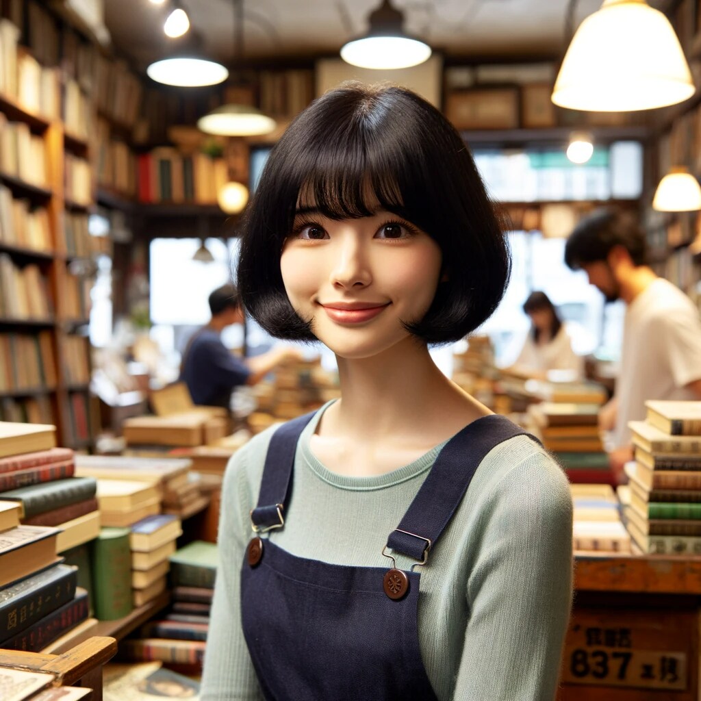 ボブヘアの黒髪の女の子が古本屋でアルバイトしているシーンのイメージ