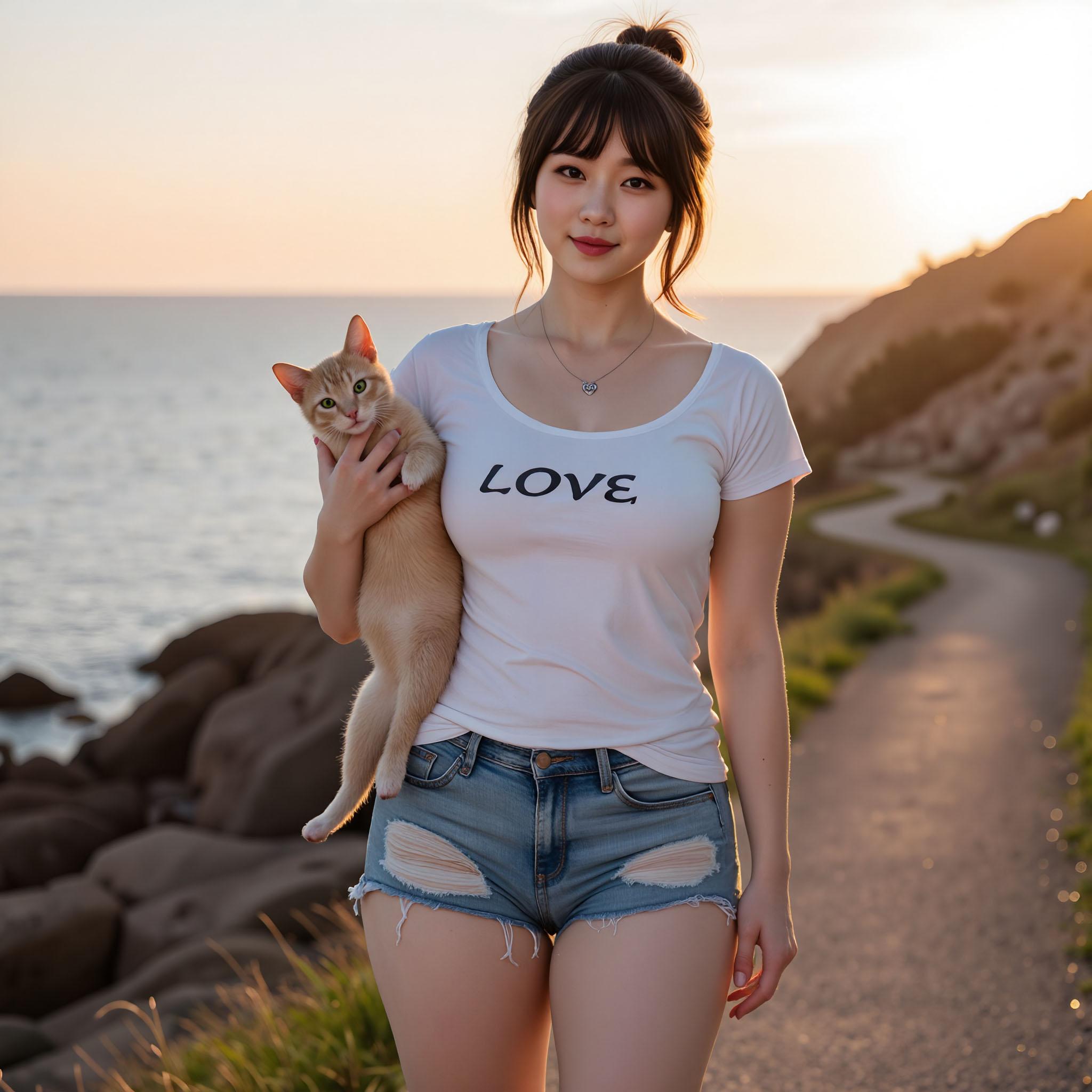 猫ちゃんを抱いて海岸沿いを歩く女性