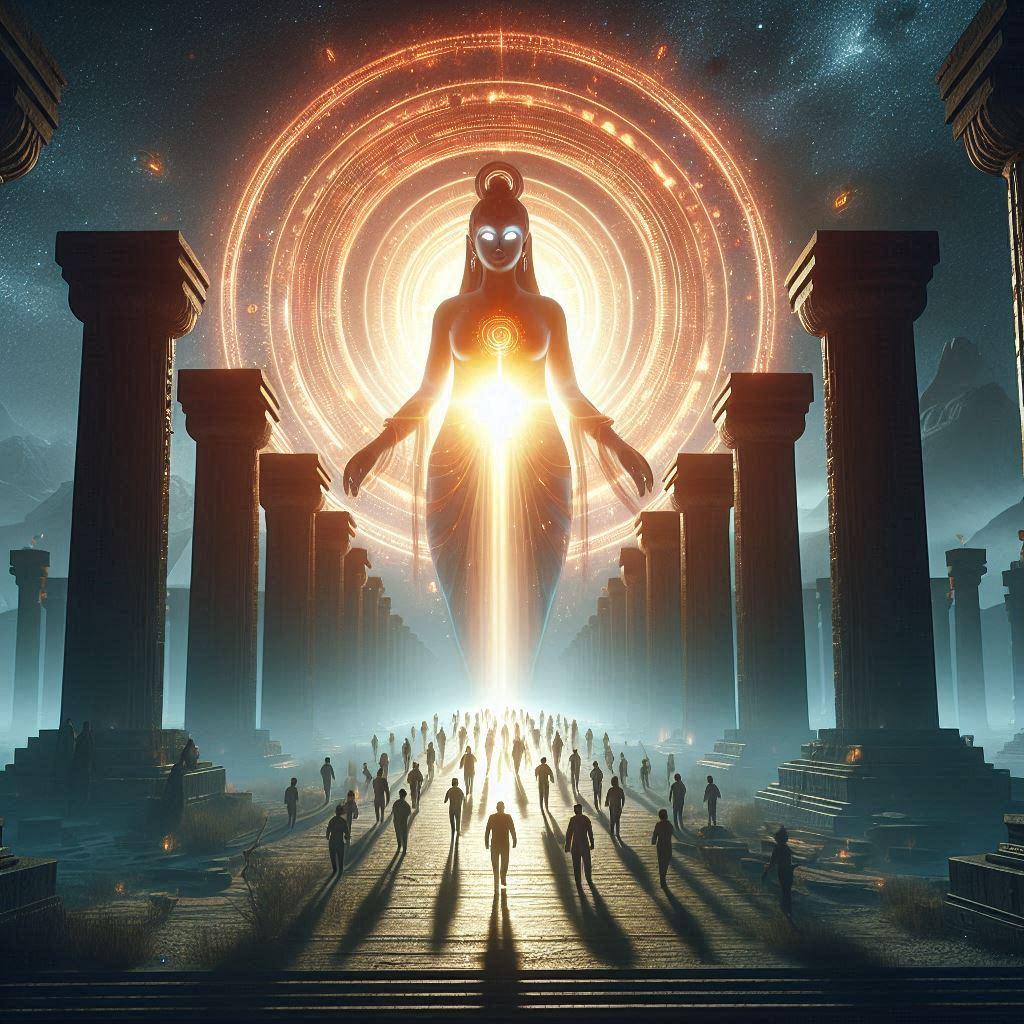 写真にはおへそから光を放ち、無数のAIを従える人物が描かれていた