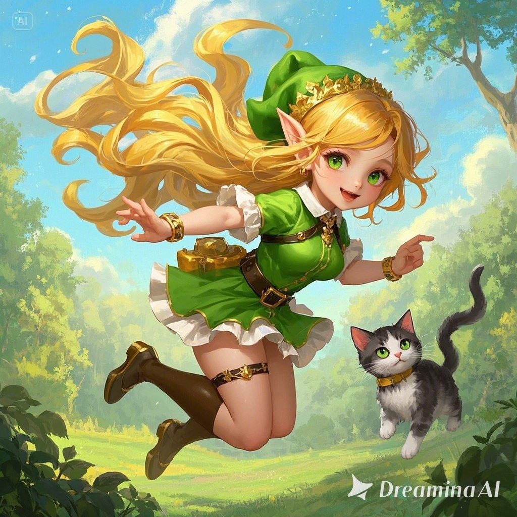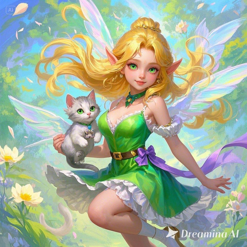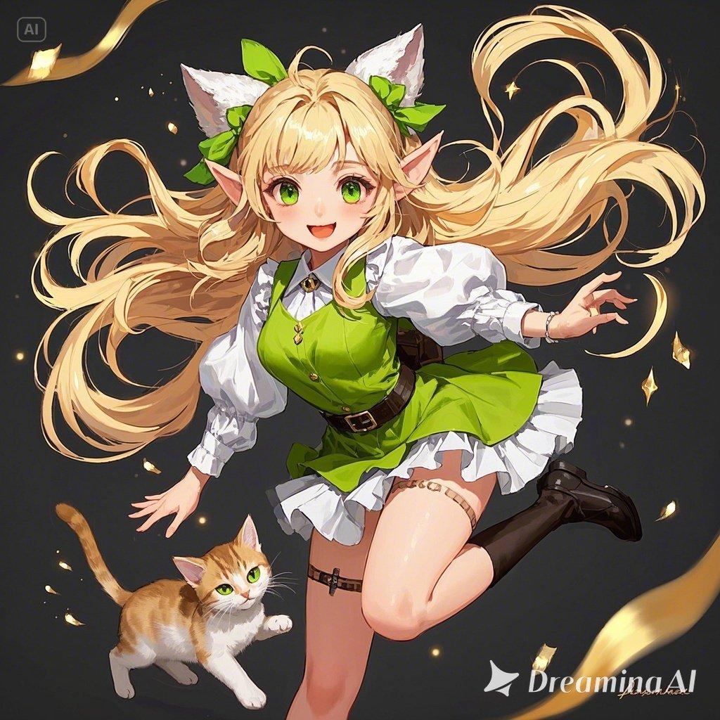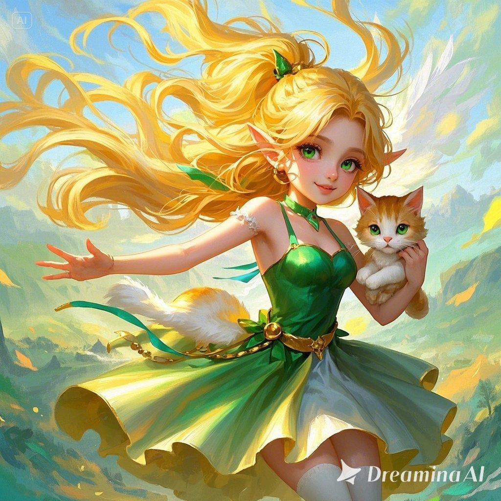 光あふれる春の森の中、エルフの少女と、ふわふわの子猫が空を舞う。