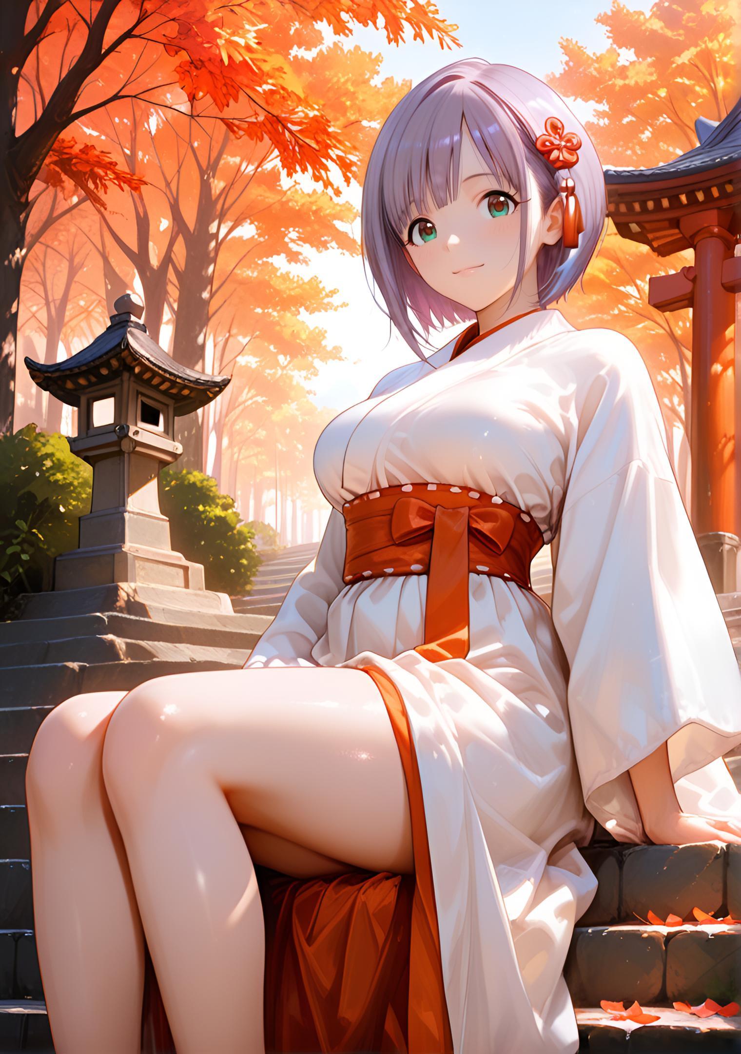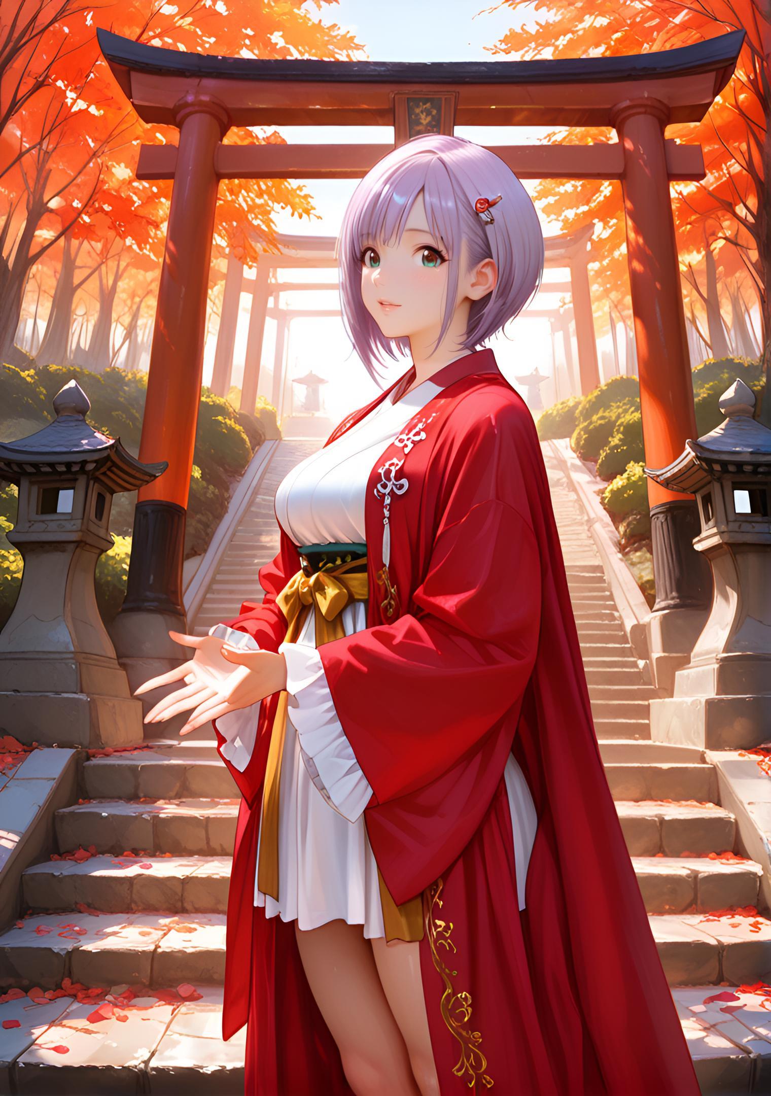 - soft white and pale purple miko outfit made of flowing silk, wide bell sleeves, red and gold embroidered obi, subtle cherry blossom motifs along hem, small golden bell hair ornament # 紫花シルク巫女