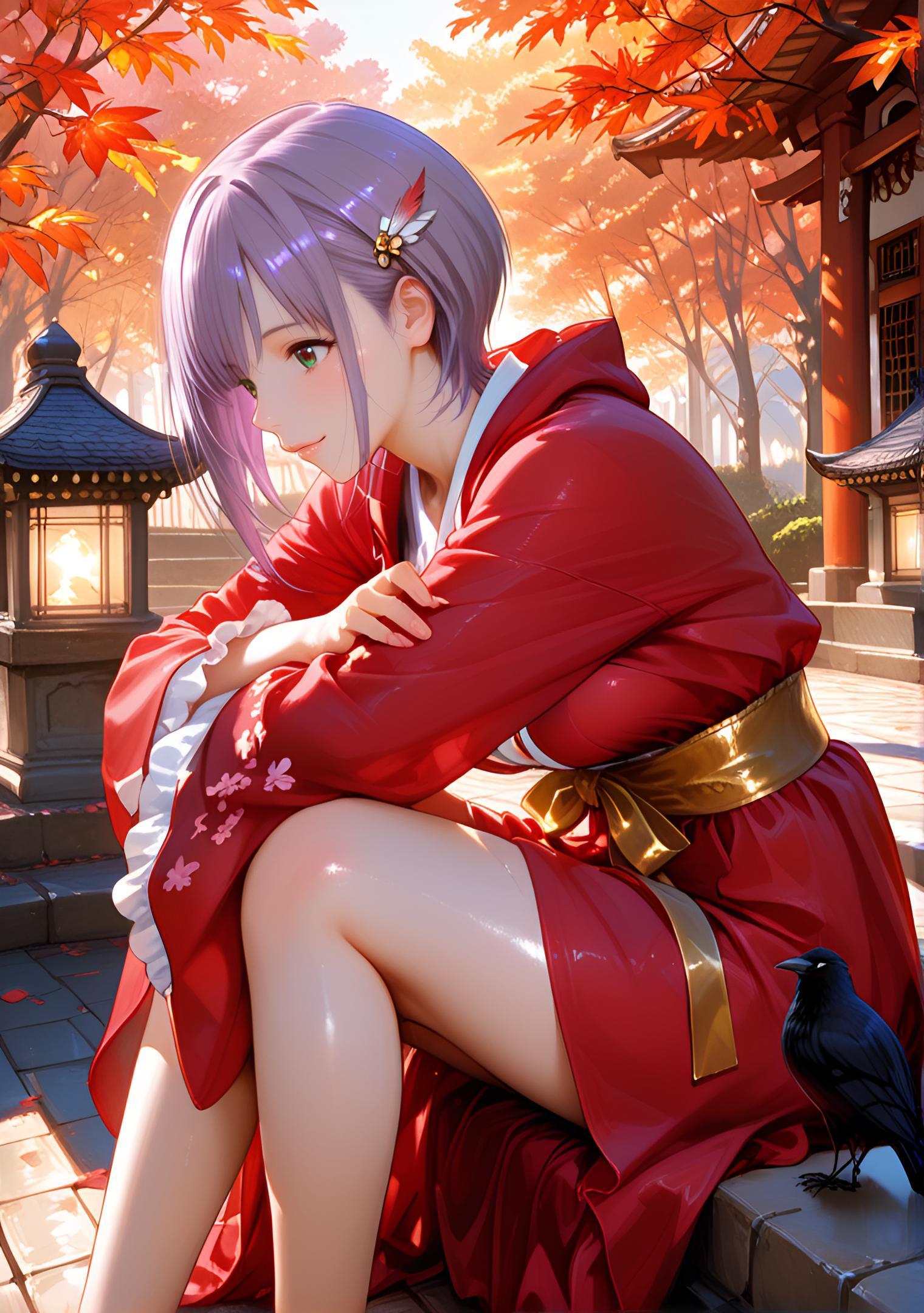 - deep crimson velvet miko robes with black vine embroidery, short frilled sleeves, golden braided obi, silver-tipped tassels on obi, crow feather hairpin # 紅唐草ベルベット巫女