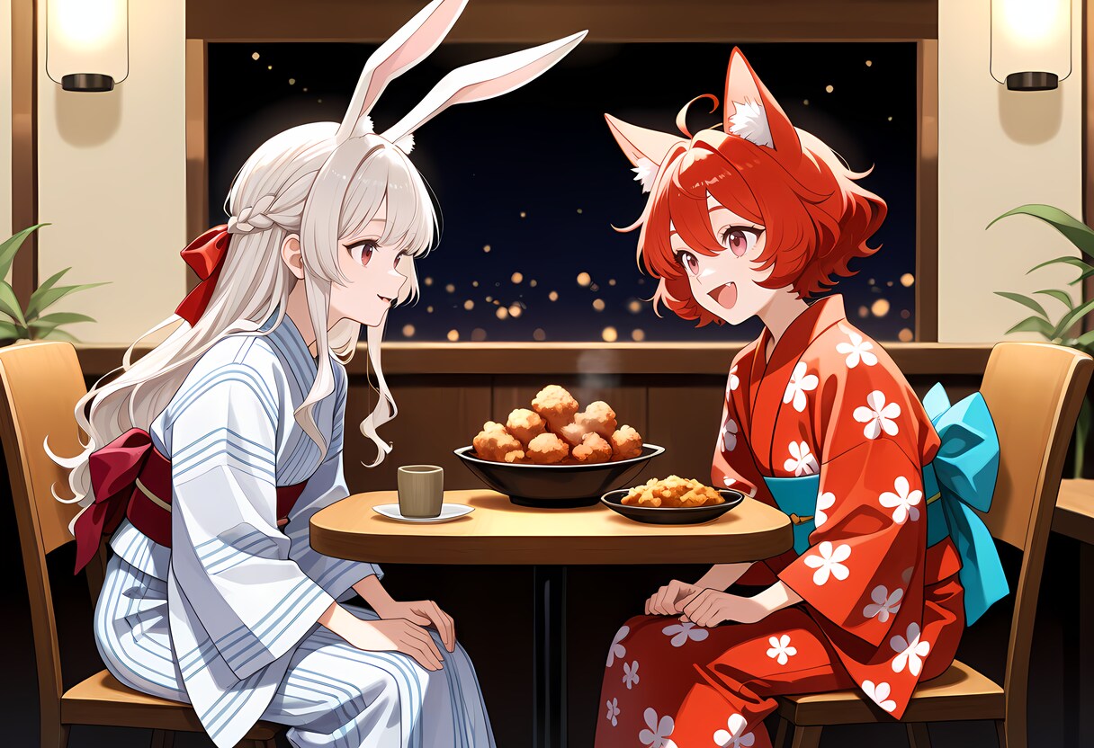 そこで、親友なる御二方、兎娘エリアーヌさんと狐娘カエデさんに、誠に勝手ながら、浴衣を着用されて夏祭りを楽しまれている時、摩訶不思議食堂の前を通りかかられて、唐揚げの香りがきっかけで入店頂き、御二方に唐揚げを楽しんで頂く場面を表現致しました。