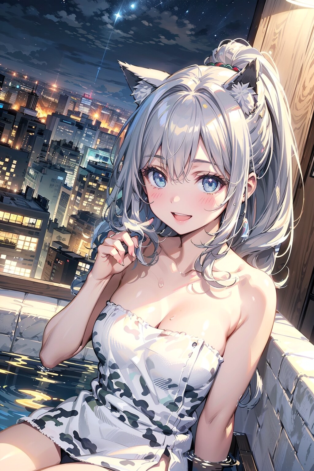🐺✨「ここは都会の夜景を楽しみながら入れる屋上露天風呂だよ♨️ボクのお気に入りの場所だよ🎶」