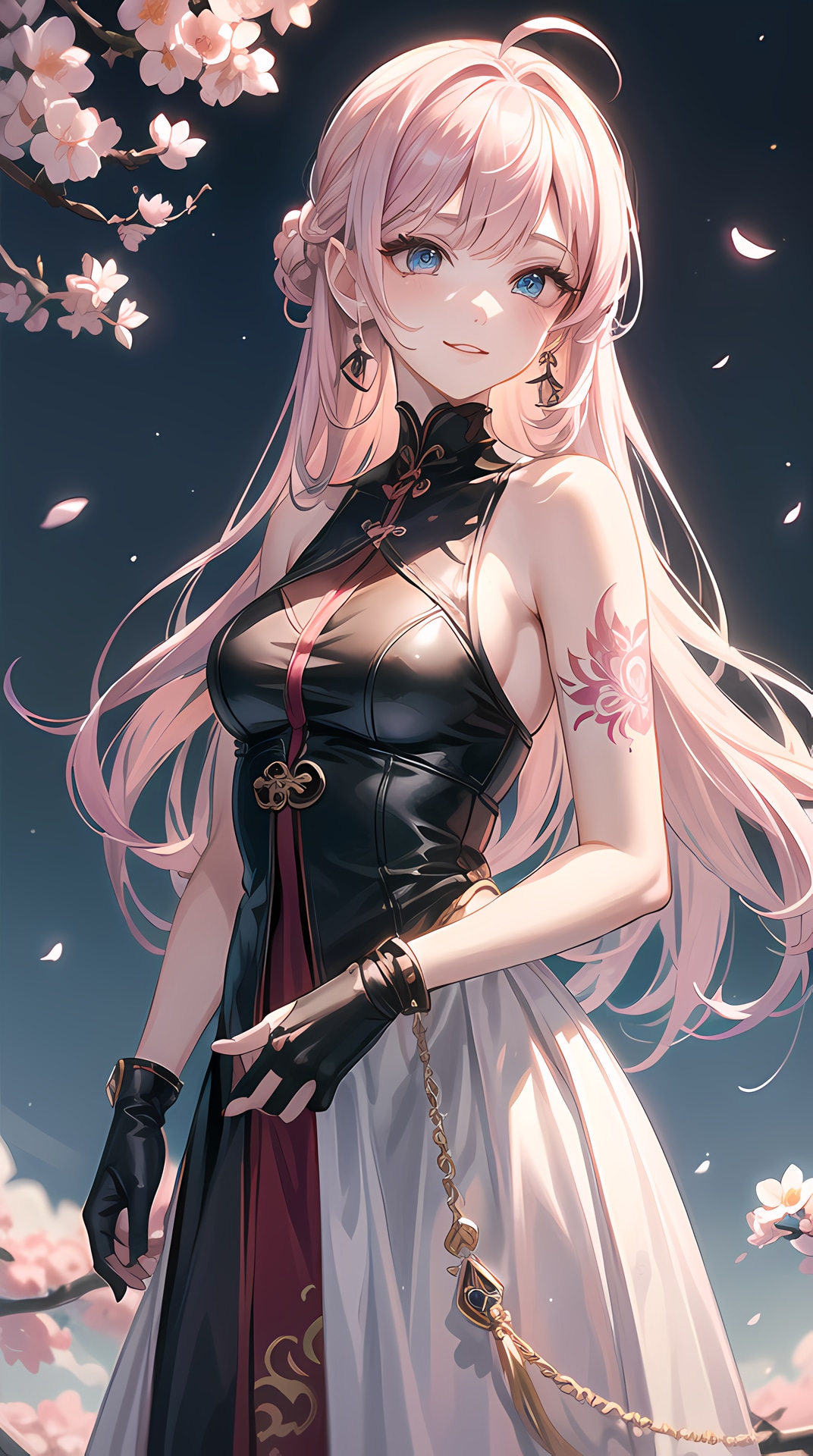 髪の色や背景の桜等ピンク色をベースに幻想的でファンタジー感も出してみました。